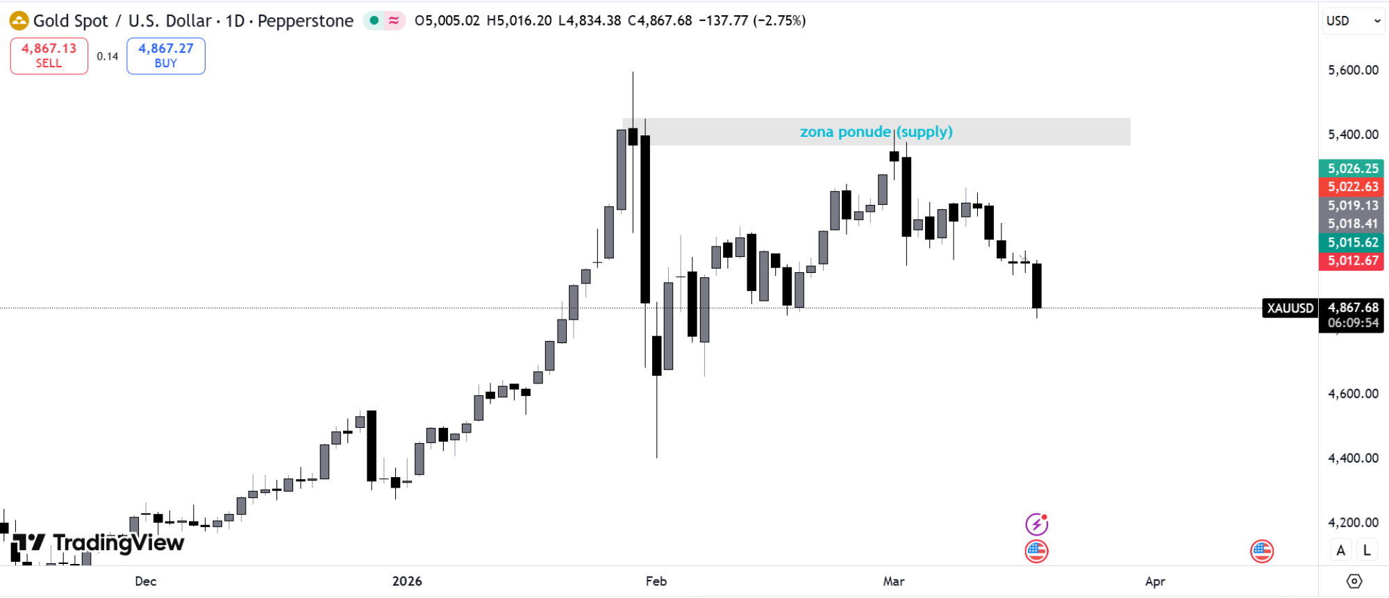 Primer takve reakcije može se videti i na grafikonu zlata. Nakon snažnog rasta cena je došla do područja u kojem se ranije pojavila intenzivna prodaja, odnosno do zone ponude sa početka 2026. godine.