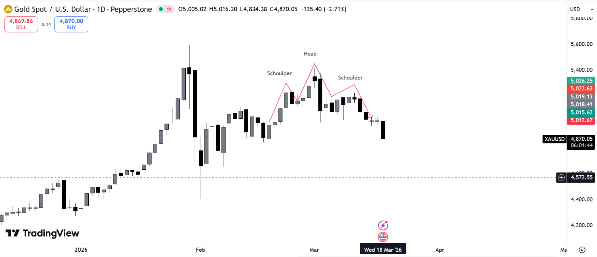 Upravo iz tog područja cena je ponovo počela da pada, i to uprkos snažnom fundamentalnom narativu vezanom za eskalaciju sukoba u Iranu, koji bi uobičajeno podržao rast zlata kao sigurne luke. Ovakvo kretanje pokazuje da tržište ne reaguje samo na vesti već pre svega na likvidnost i nivoe na kojima se aktiviraju veliki nalozi.