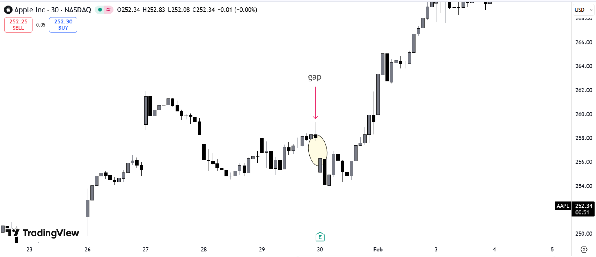 Takođe, ako se vratimo na malopređašnji primer Apple-a, videli smo jasno da postoji gap. Sledeće što očekujemo jeste da on bude popunjen, što se i desilo, ali nismo videli nastavak silaznog trenda.