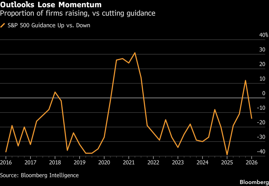 Već nakon prve nedelje sezone objava rezultata, prognoze šalju upozoravajuće signale. Više analitičara smanjuje procene dobiti nego što ih povećava. Istovremeno, udeo kompanija koje podižu i prognoze dobiti i prihoda opada, pokazuju podaci 22V Research. Takav obrazac se javljao "u periodima značajnih promena u smernicama", uključujući finansijsku krizu 2008. i pandemiju 2021. godine, navodi 22V. Oba perioda prethodila su snažnim medveđim tržištima.