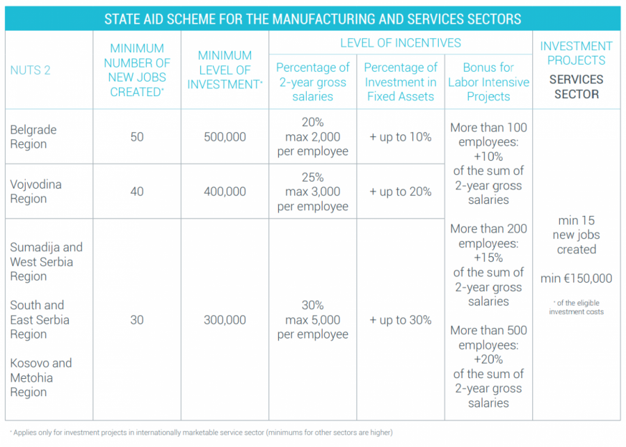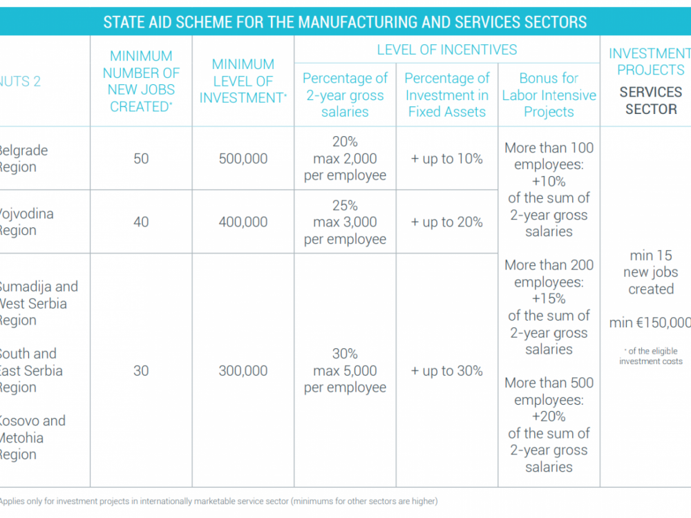 "Radi ublažavanja početnih kapitalnih ulaganja i olakšavanja pokretanja poslovnih aktivnosti, Vlada Srbije nudi finansijsku podršku za projekte u sektoru proizvodnje, projekte koji se odnose na usluge servisnih centara, kao i projekte u sektoru hotelskog smeštaja u banjskim i klimatskim mestima", ističe se.