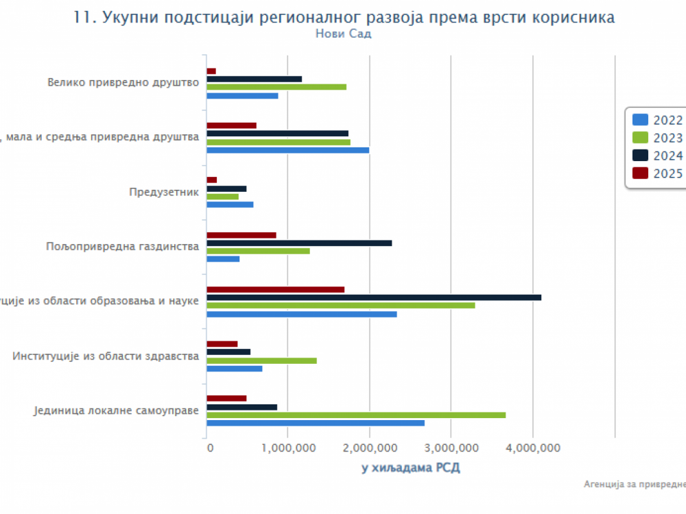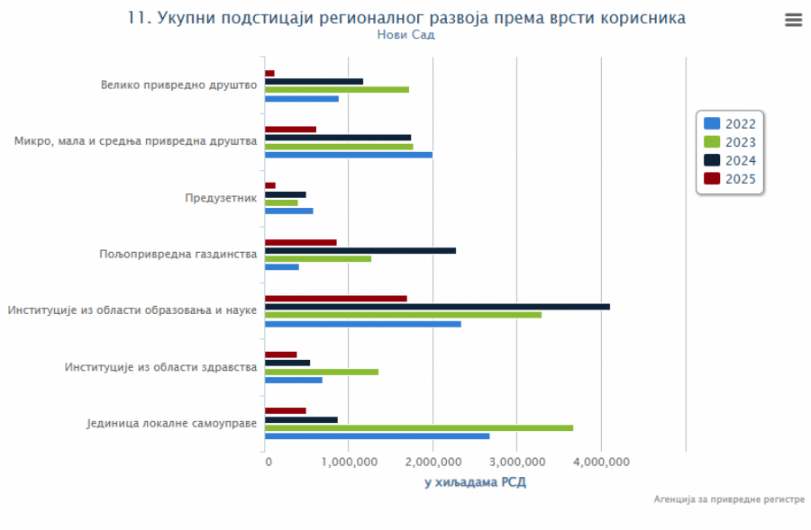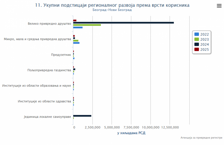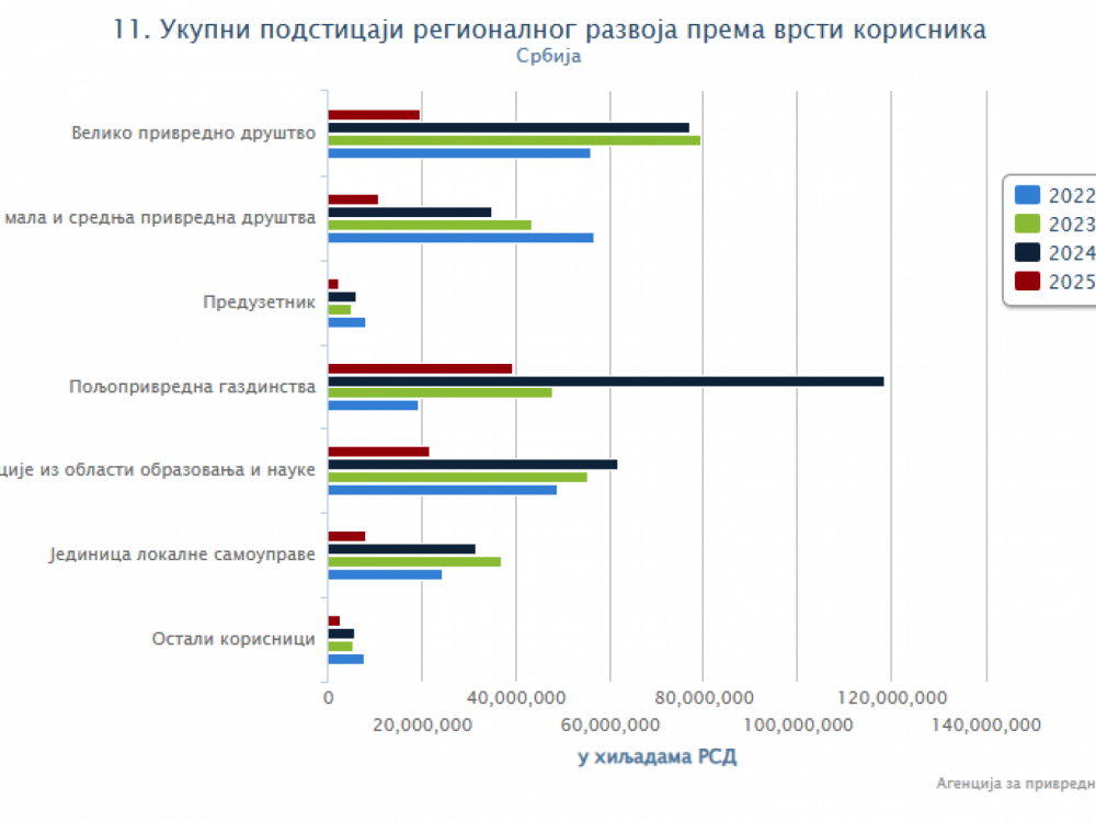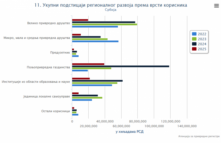 Prema bazi Agencije za privredne registre (APR), koja pruža pregled podsticaja regionalnog razvoja, u Srbiji je prošle godine izdvojeno skoro 350 milijardi dinara podsticaja za preko milion korisnika, dok je u prvoj polovini ove godine dato više od 108 milijardi dinara za manje od 350.000 korisnika.