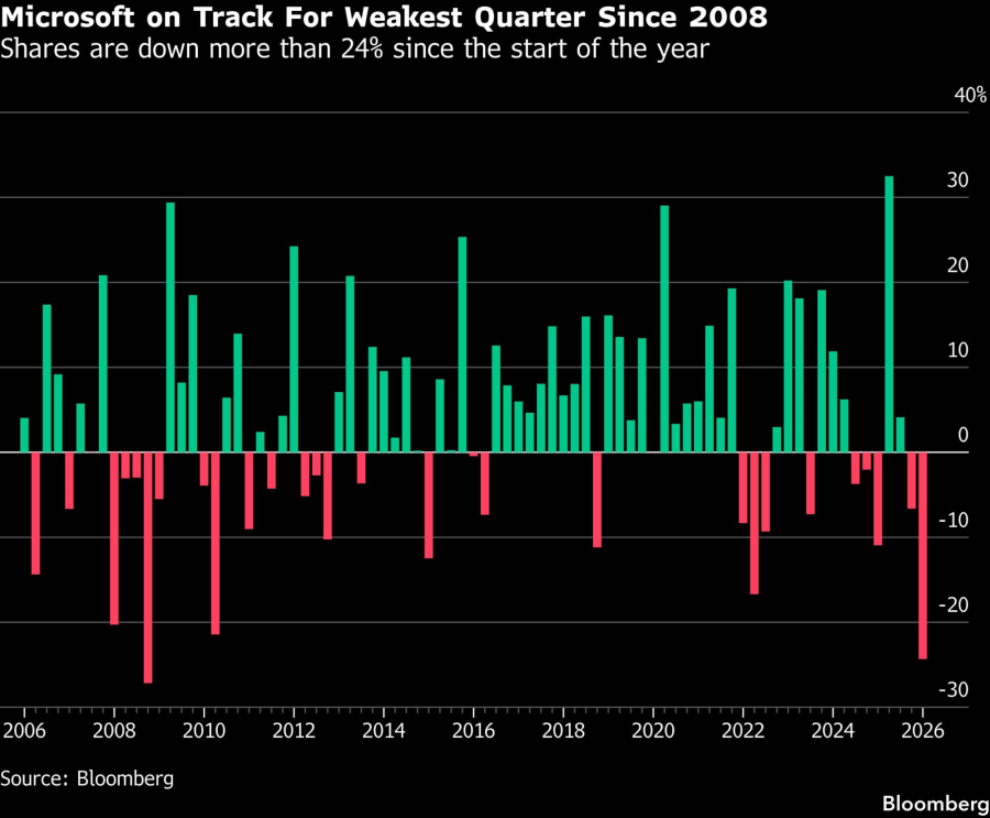 Kompanija Microsoft Corp. nalazi se na preseku dva zabrinjavajuća trenda koja potresaju tehnološki sektor, zbog čega su njene akcije na putu ka najslabijem kvartalnom učinku još od globalne finansijske krize pre dve decenije.