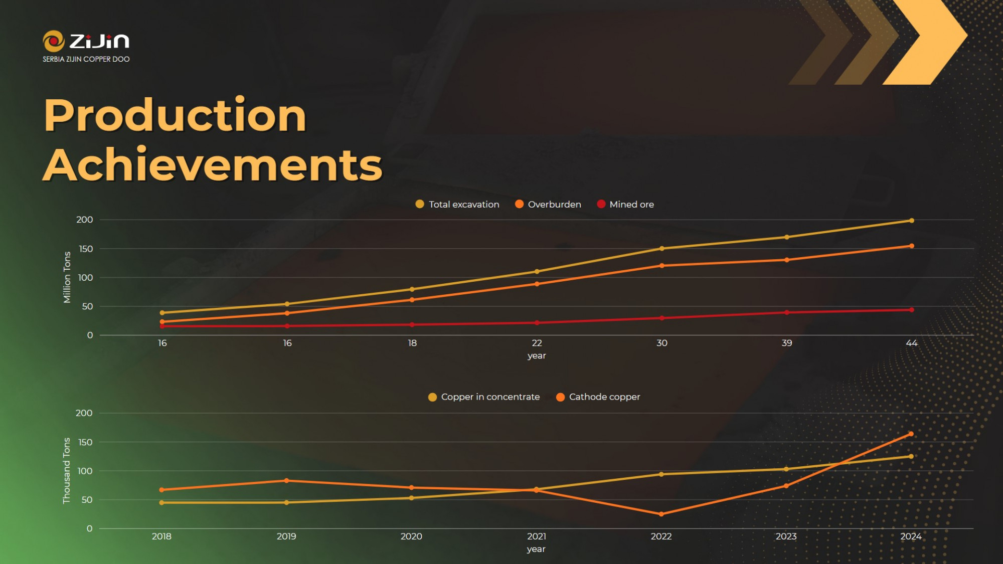 Od preuzimanja vlasništva u nekadašnjem RTB Bor do kraja decembra 2024. godine, Serbia Zijin Copper proizvela je ukupno 487.868 tona bakra u koncentratu i 12.405 kilograma zlata.