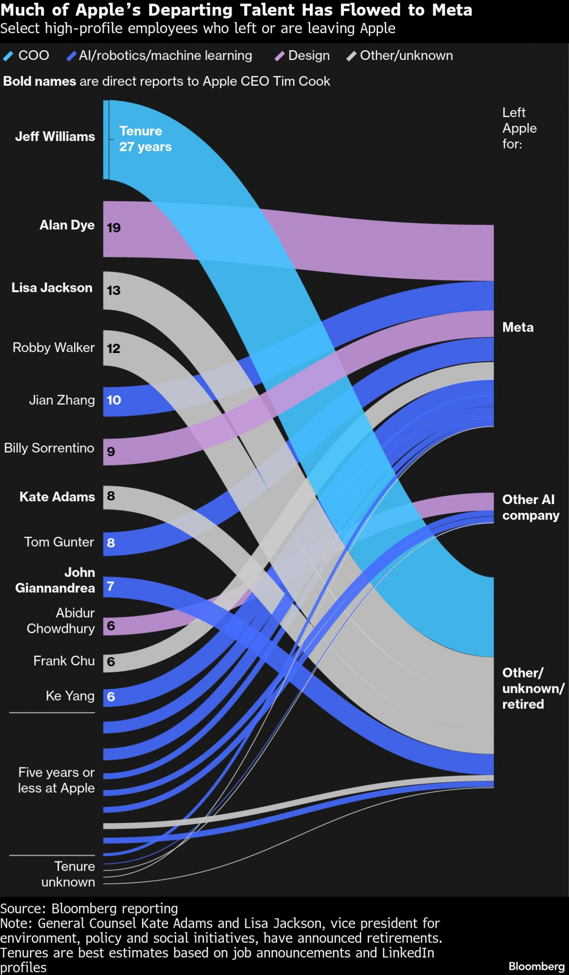 Samo u protekloj sedmici, rukovodioci Applea za veštačku inteligenciju i dizajn interfejsa dali su ostavke. Zatim je kompanija najavila odlazak svog glavnog pravnog savetnika i direktora za državne poslove. Sva četiri izvršna direktora direktno su bili podređeni izvršnom direktoru Timu Cooku, što predstavlja izuzetan nivo fluktuacije u Appleovom C-level menadžmentu.