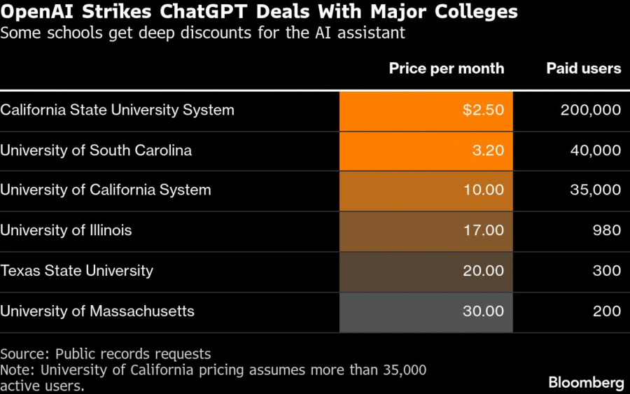 Prema narudžbenicama koje je pregledao Bloomberg, kompanija je prodala više od 700.000 licenci za ChatGPT za oko 35 javnih univerziteta, namenjenih studentima i nastavnom osoblju. Nasuprot tome, Microsoft Corp., koji svoj Copilot asistent obično nudi u paketu sa postojećim softverom, beleži umerenije usvajanje tog alata na ovim školama, i češće ga koriste nastavnici nego studenti.