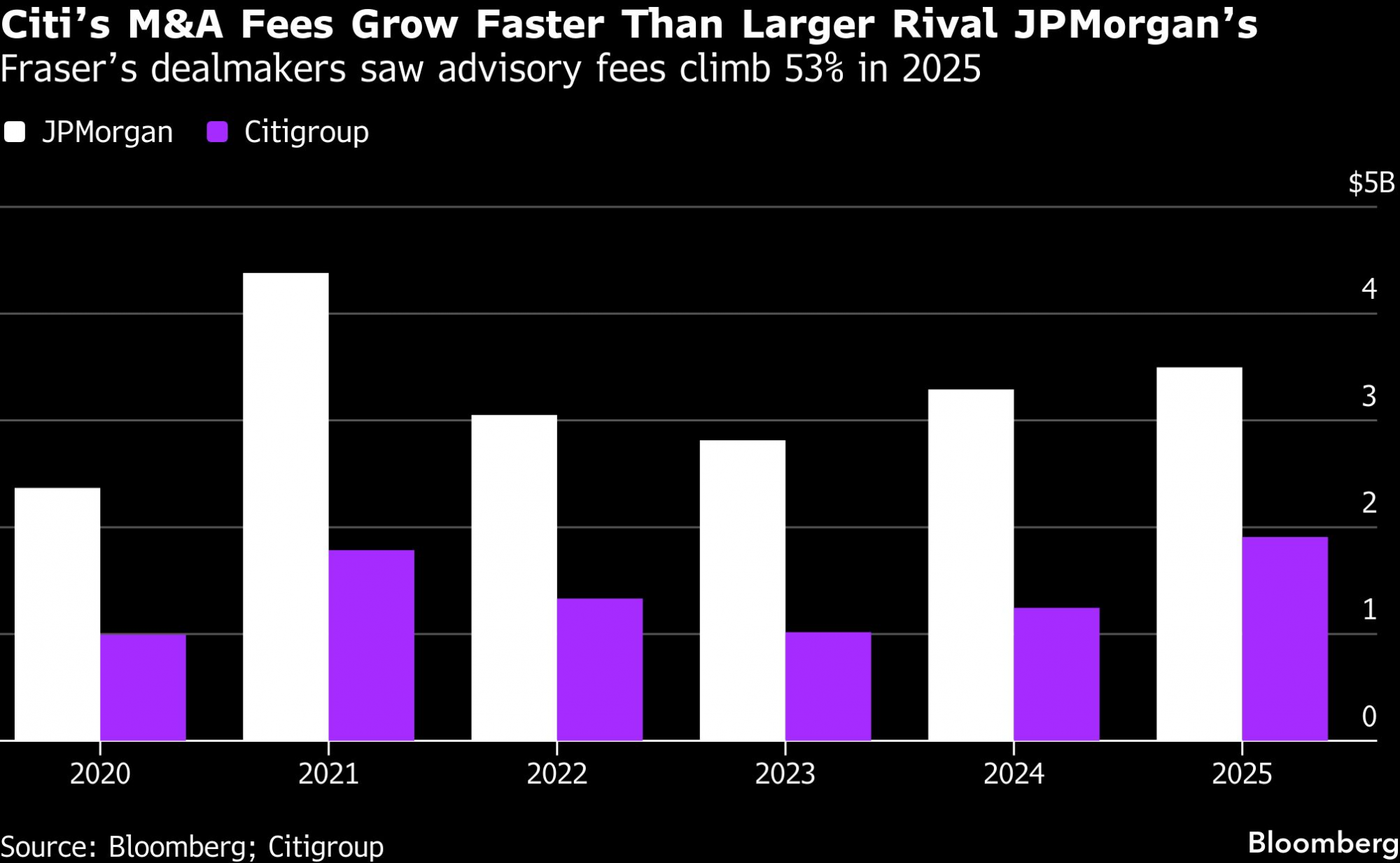 Banka na čijem je čelu izvršna direktorka Jane Fraser zabeležila je skok od 84 odsto u finansijsko-savetodavnim naknadama u četvrtom kvartalu, čime je zaokružila godinu u kojoj su prihodi kompanije od posredovanja u spajanjima porasli za više od polovine, na istorijski rekord. Taj učinak, objavljen u izveštaju o zaradi u sredu, nadmašio je relativno mlak rast tog poslovanja kod većeg rivala JPMorgan Chase & Co., koji je u 2025. iznosio svega šest odsto.