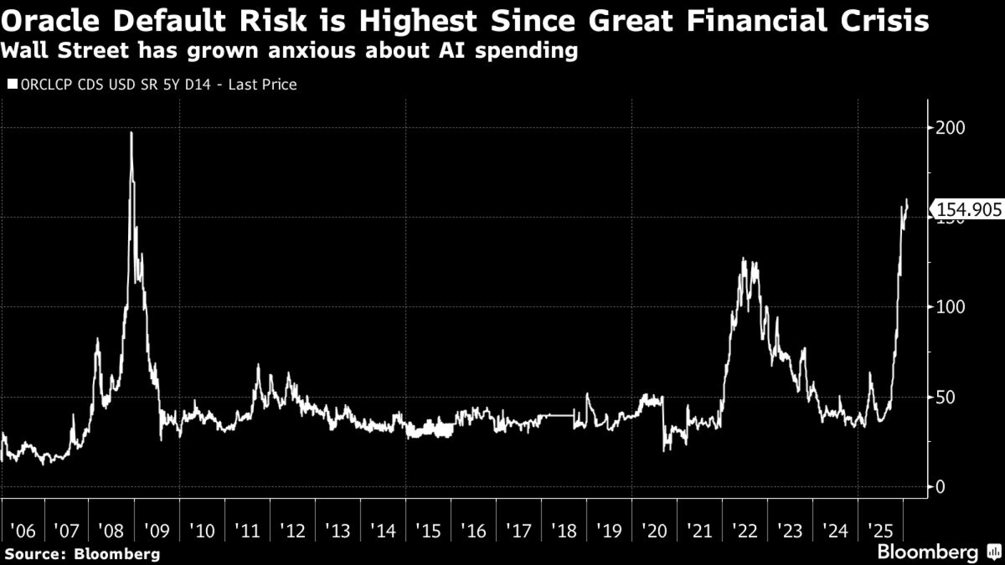 Kako je dug Oraclea rastao, a Wall Street pojačavao zabrinutost zbog mogućeg balona u oblasti veštačke inteligencije, investitori su pohrlili da kupuju kreditne svopove na neizvršenje obaveza vezane za Oracle, što je do decembra gurnulo cene nekih od tih derivata na najviši nivo još od finansijske krize 2008. godine.