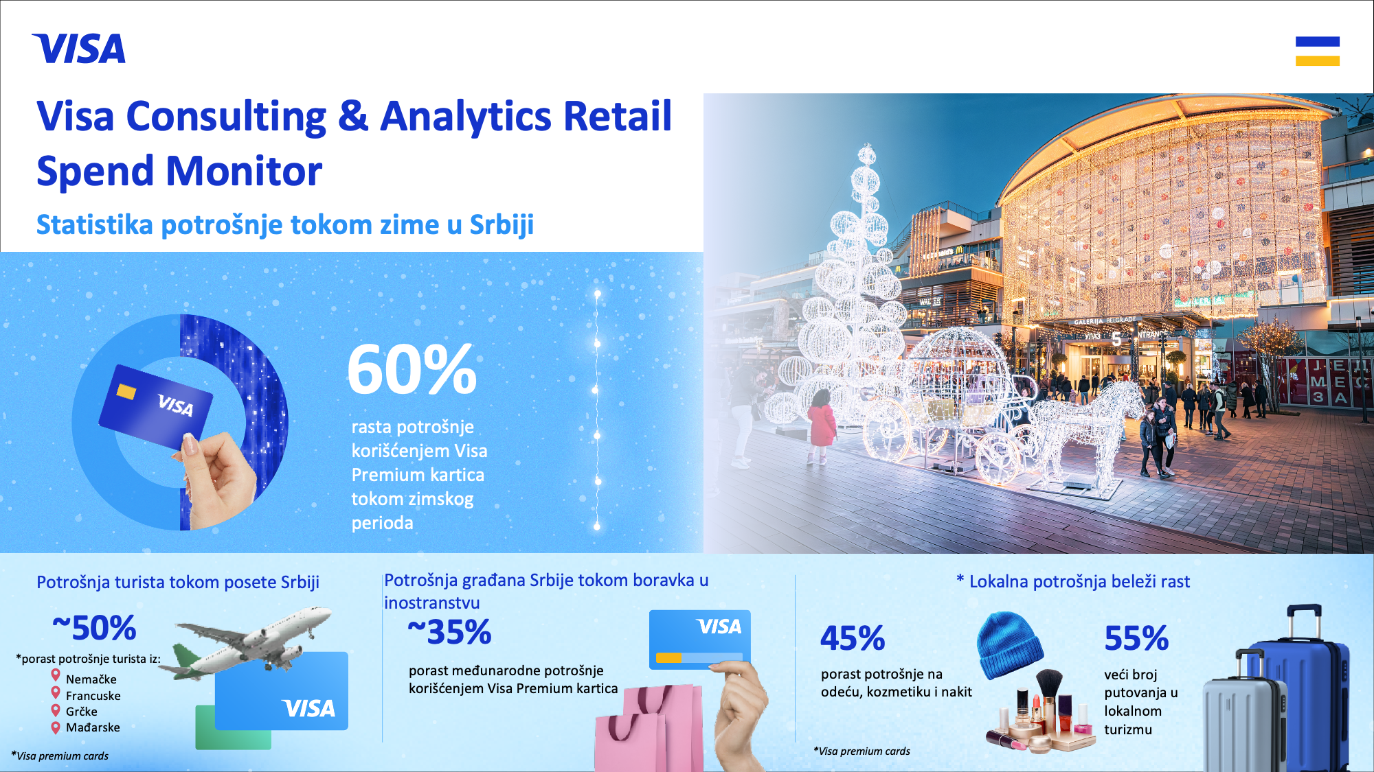 Visa, globalni lider u digitalnim plaćanjima, objavila je najnovije podatke o potrošačkim navikama tokom zimskog prazničnog perioda 2025. godine u Srbiji, na osnovu podataka Visa Consulting & Analytics Retail SpendMonitora. Istraživanje pokazuje da je potrošnja korišćenjem Visa premium kartica tokom zime porasla za 60 odsto u odnosu na prethodnu godinu, što ukazuje na veći broj putovanja i obilaska Srbije, a i veću potrošnju u ugostiteljstvu i segmentu zabave.