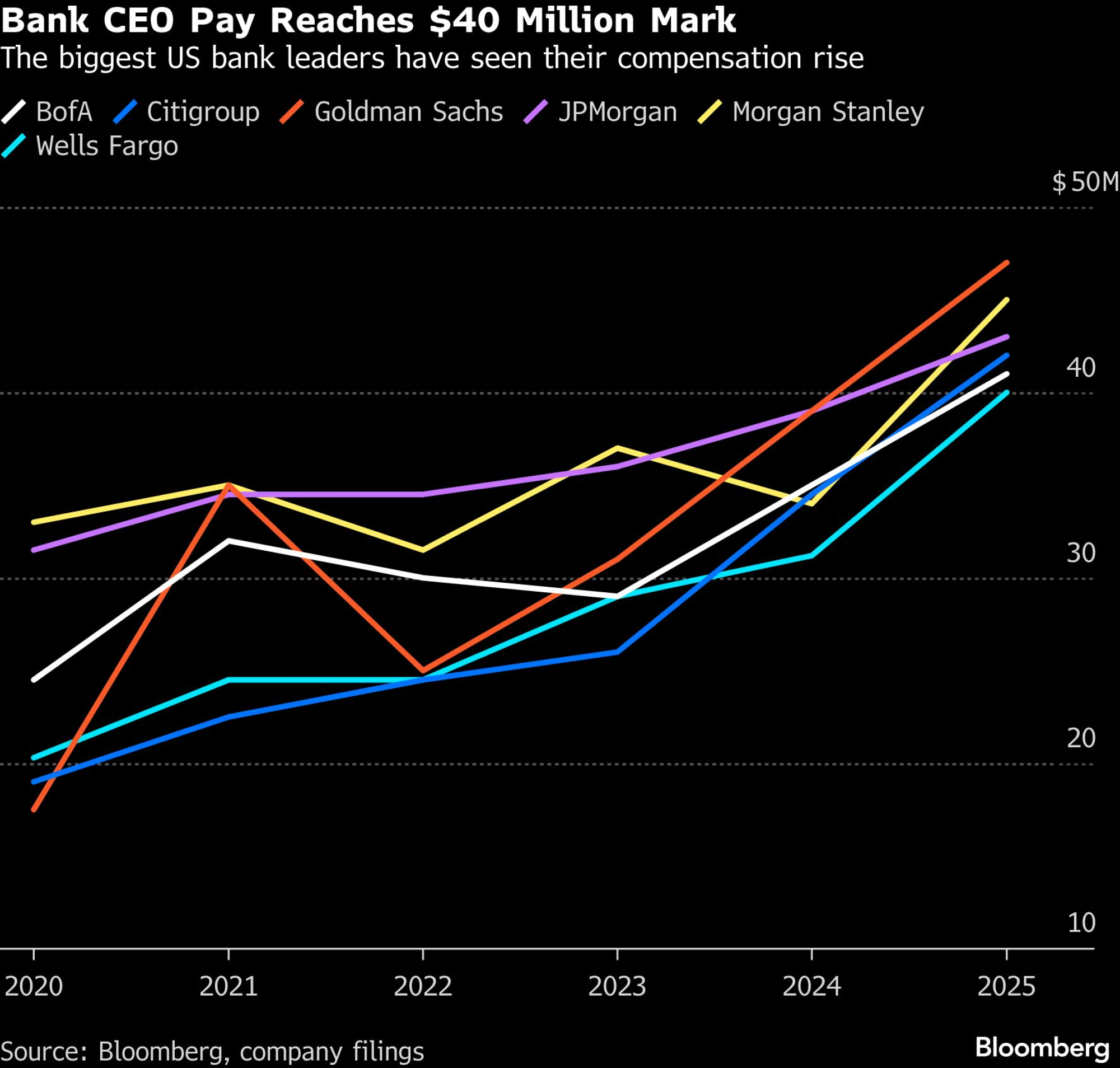 Izvršni direktori najvećih američkih banaka primili su godišnje naknade od najmanje 40 miliona dolara, pri čemu je njihova ukupna plata premašila rekorde postavljene 2006. i 2021. godine. Brian Moynihan iz Bank of America Corp. bio je poslednji izvršni direktor čija je plata objavljena, a njegova naknada je prošle godine porasla za 17 odsto i iznosila 41 milion dolara. Citigroup Inc. je ove nedelje saopštio da je povećao platu izvršnog direktora Jane Fraser za 22 odsto na 42 miliona dolara za 2025. godinu, što je znak poverenja odbora u njenu sposobnost da preokrene kompaniju nakon godina slabijeg poslovanja u odnosu na konkurente.