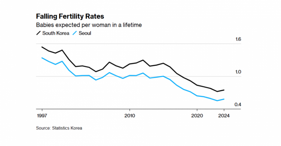Stopa fertiliteta ili rađanja (označava prosečan broj dece koje žena rodi tokom reproduktivnog perioda, prim. prev.) u Južnoj Koreji iznosi samo 0,75 deteta po ženi i najniža je u svetu. Demografske projekcije ukazuju da bi broj stanovnika mogao da se smanji za gotovo trećinu do 2072. godine ako se nastavi sadašnji trend. Posledice su ozbiljne: nedostatak radne snage, smanjenje prihoda od poreza, prazne škole, društvo koje je sve starije i bez ljudi koji bi negovali stare, dok vojsku muče problemi sa regrutacijom. Vlasti su potrošile stotine milijardi dolara na rešavanje ovog problema različitim merama, od novčanih podsticaja za rađanje do subvencija za rešavanje stambenog pitanja i poreskih olakšica, ali sve te mere su bile delimično uspešne. Kompanije su se sada, u strahu od budućnosti u kojoj neće biti radnika (i istovremeno u želji da privuku stručni kadar), priključile ovim izdašnim davanjima.