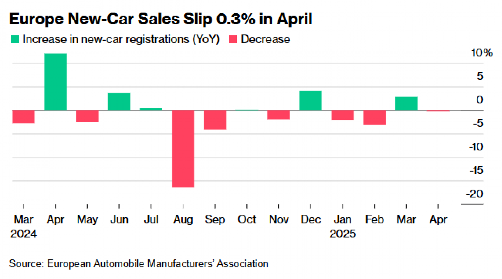 Prodaja automobila u Evropi pala je u aprilu zbog slabijeg privrednog rasta i nesigurnosti izazvane globalnim trgovinskim napetostima, što je navelo potrošače da odlože veće kupovine.