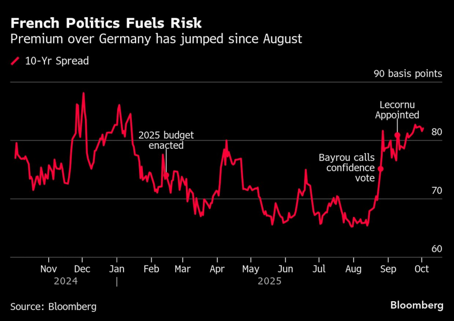 Francuske obveznice su pale jer su se investitori pripremali za veću političku neizvjesnost. Prinos na desetogodišnje obveznice porastao je za devet baznih poena na 3,6 odsto. To je proširilo premiju zaduživanja nacije u odnosu na nemački dug, ključni pokazatelj fiskalnog rizika, na preko 89 baznih poena, što je najviši nivo od kraja 2024. godine.