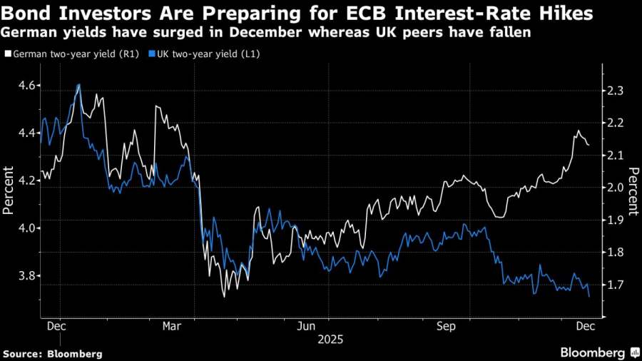 Takav razvoj događaja navodi trgovce da preispitaju izglede za prinose na obveznice i kretanja valuta. Prinosi na nemačke dvogodišnje obveznice, koje predstavljaju referentnu tačku za evrozonu, porasli su ovog meseca za oko deset baznih poena, zbog izgleda za ponovno pooštravanje monetarne politike od strane Evropske centralne banke.