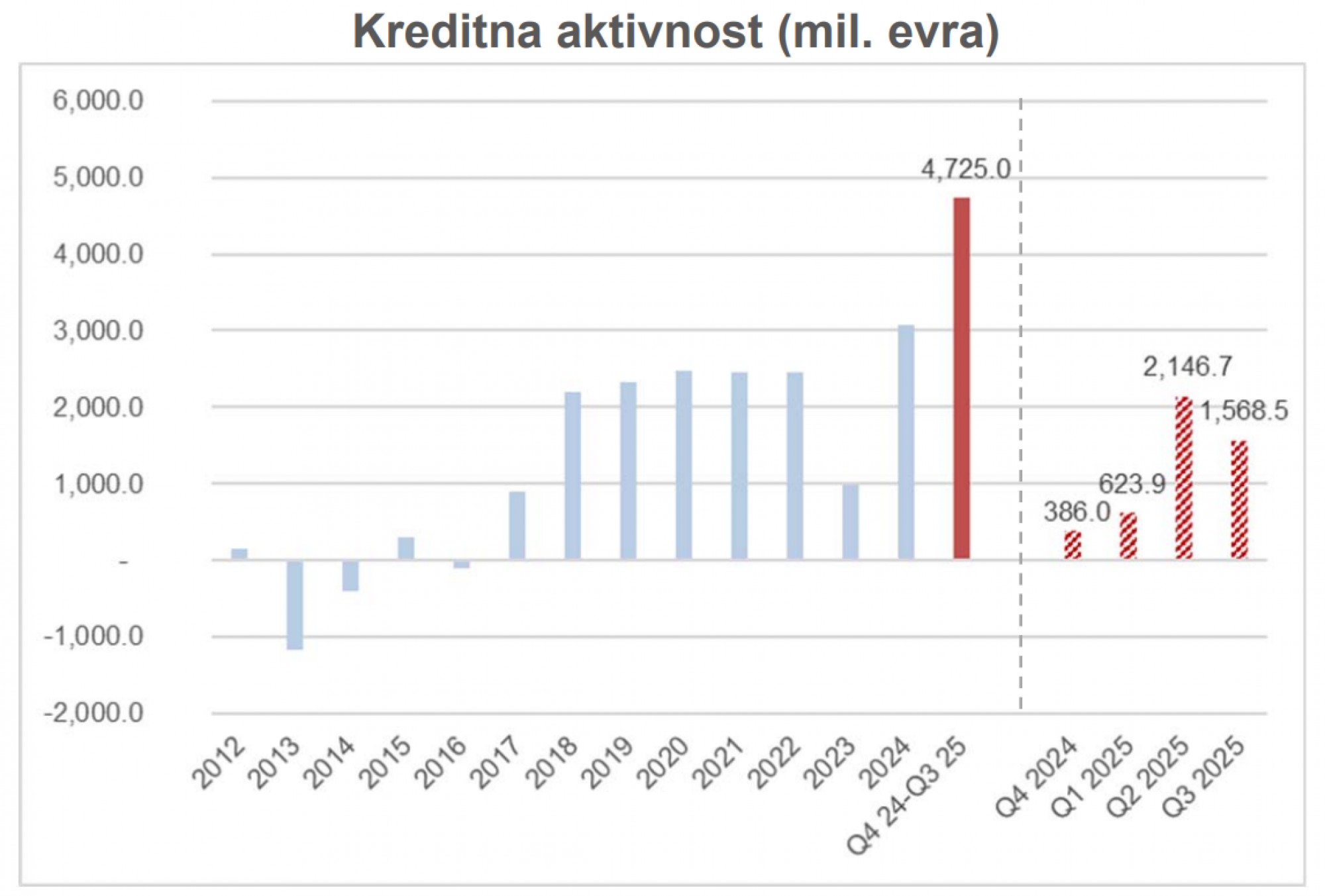 "Kreditni plasmani privredi i stanovništvu su u trećem lanjskom kvartalu porasli za 1,57 milijardi evra. To je nešto sporije u odnosu na drugi kvartal, ali svakako predstavlja vrlo snažan međugodišnji rast. Na nivou poslednja četiri kvartala - od četvrtog kvartala 2024. do trećeg kvartala 2025. godine - ukupan rast kreditne aktivnosti u Srbiji je 4,7 milijardi evra", kazao je nedavno Saša Ranđelović, profesor Ekonomskog fakulteta u Beogradu.