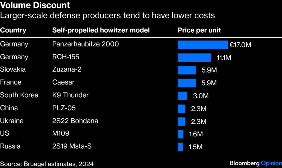 Velike evropske zemlje imaju sopstvene vojne industrije: Francuska uglavnom kupuje francusko naoružanje, Nemačka nemačko. Rezultat je skupa proliferacija neusklađenih sistema oružja koji se ne proizvode u velikim serijama. Evropa godišnje proizvede oko pedeset glavnih borbenih tenkova, dok Rusija proizvodi više od 1.500. Novi nemački Leopard 2A8 košta 29 miliona evra, dok ruski T-90 košta oko četiri miliona evra (nivoi uključene logistike i podrške mogu da se razlikuju). Kada je reč o ključnim, takozvanim strateškim kapacitetima, poput satelitske obaveštajne infrastrukture i vazdušnog transporta, Evropa je u velikoj meri zavisna od Sjedinjenih Američkih Država.