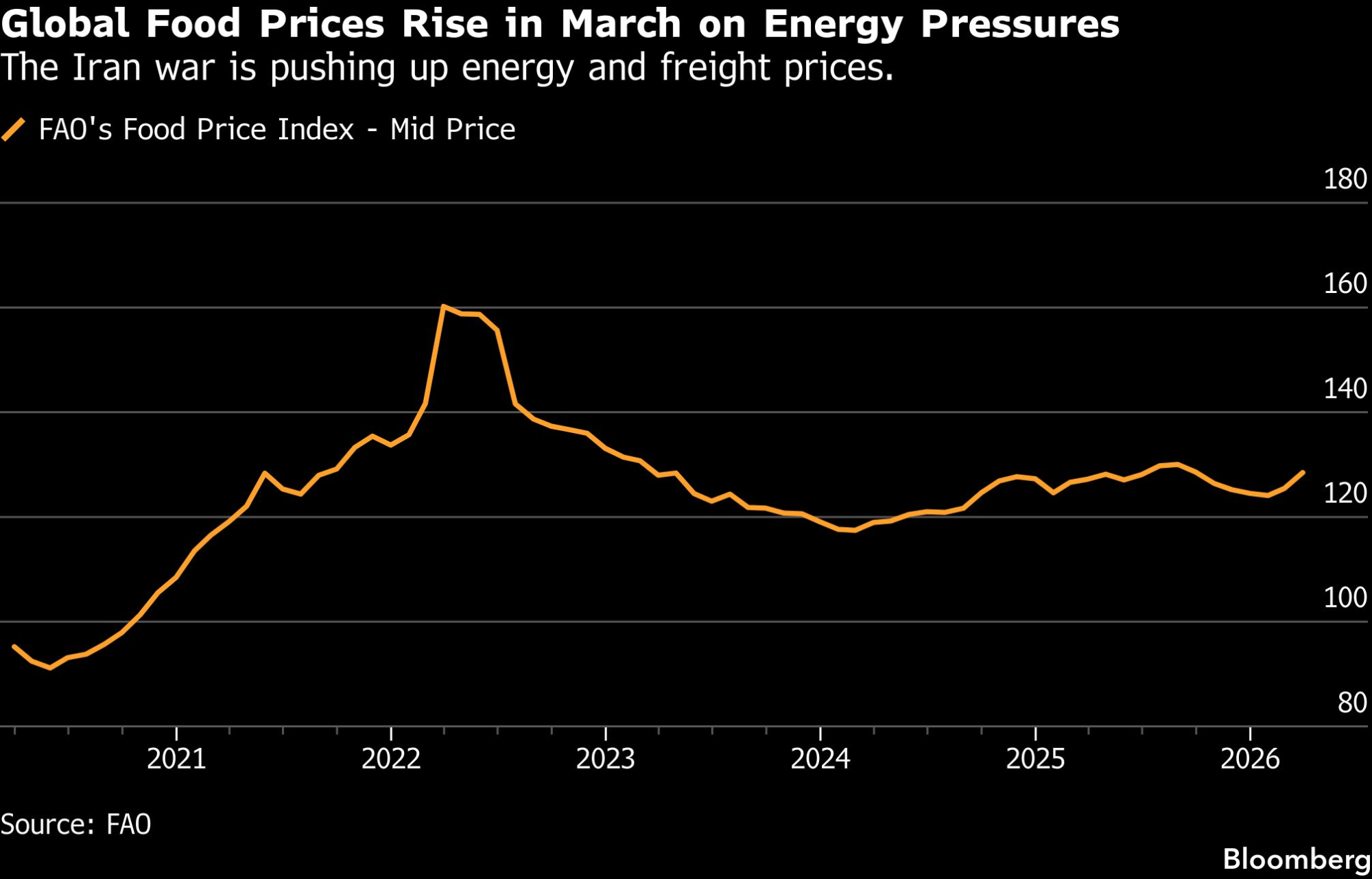 Cene hrane u svetu porasle su u martu, podstaknute višim cenama energije i rastom troškova transporta povezanih s ratom na Bliskom istoku. Indeks cena prehrambenih sirovina koji objavljuje Organizacija za hranu i poljoprivredu (FAO) iznosio je u proseku 128,5 poena u martu, što je za tri poena više nego u februaru, preneo je Bloomberg.