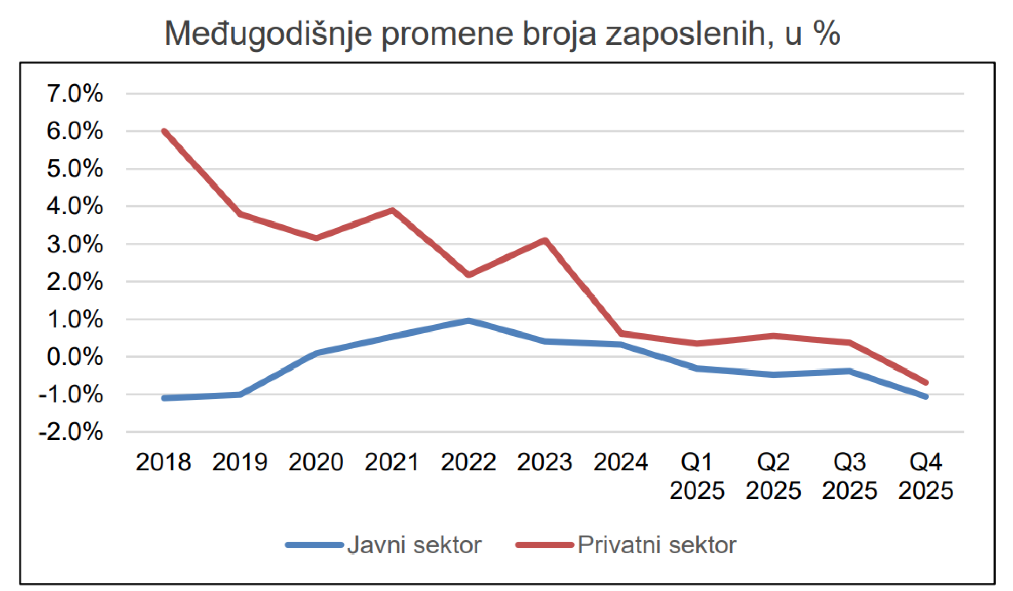 Slično kretanjima na nivou cele godine, i četvrti kvartal 2025. je imao smanjenje neformalno zaposlenih koje je procenutalno bilo dosta veće od smanjenja formalno zaposlenih. Uz to, zabeleženo je manje zaposlenih i u javnom i u privatnom sektoru (tu je takođe pad i kvartalni i međugodišnji). Ali zašto ekonomisti ovo vide pre kao kraj jedne ere na domaćem tržištu rada, a ne samo kao prolaznu tendenciju?