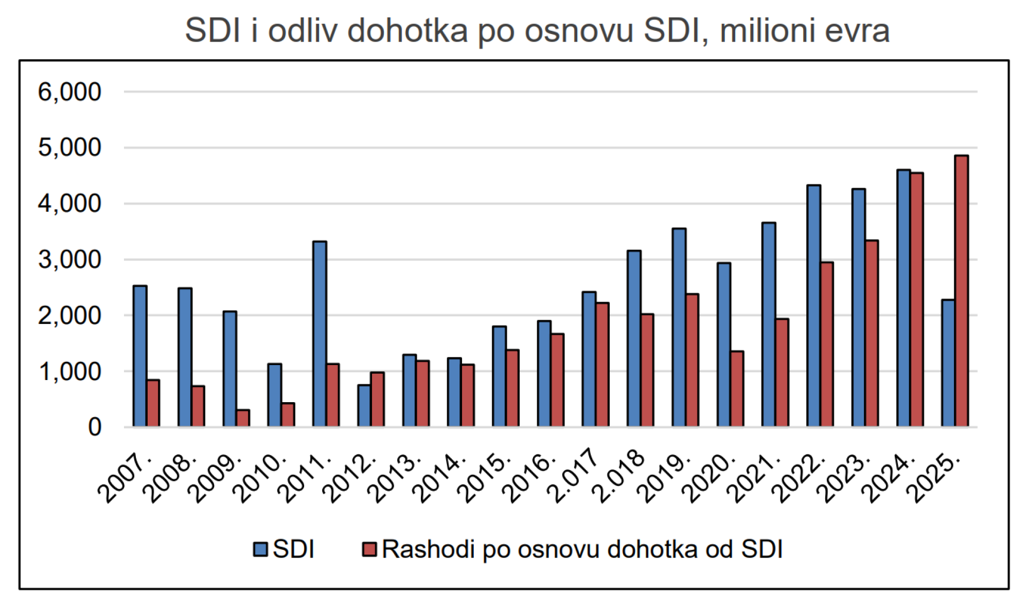 Uz to, "još jedan zanimljiv indikator povezan sa SDI je rastući odliv dividendi od ovih ulaganja". "Posle završetka ciklusa investiranja uobičajeno je da strani investitori počinju da izvlače svoje profite iz zemlje domaćina, što se sad i u Srbiji uveliko dešava. Odlivi deviza iz zemlje po osnovu poslovanja SDI u 2025. iznosili su 4,6 milijardi evra, tj. bili su znatno veći od priliva novih direktnih investicija iz inostranstva", kaže se u Kvartalnom monitoru.