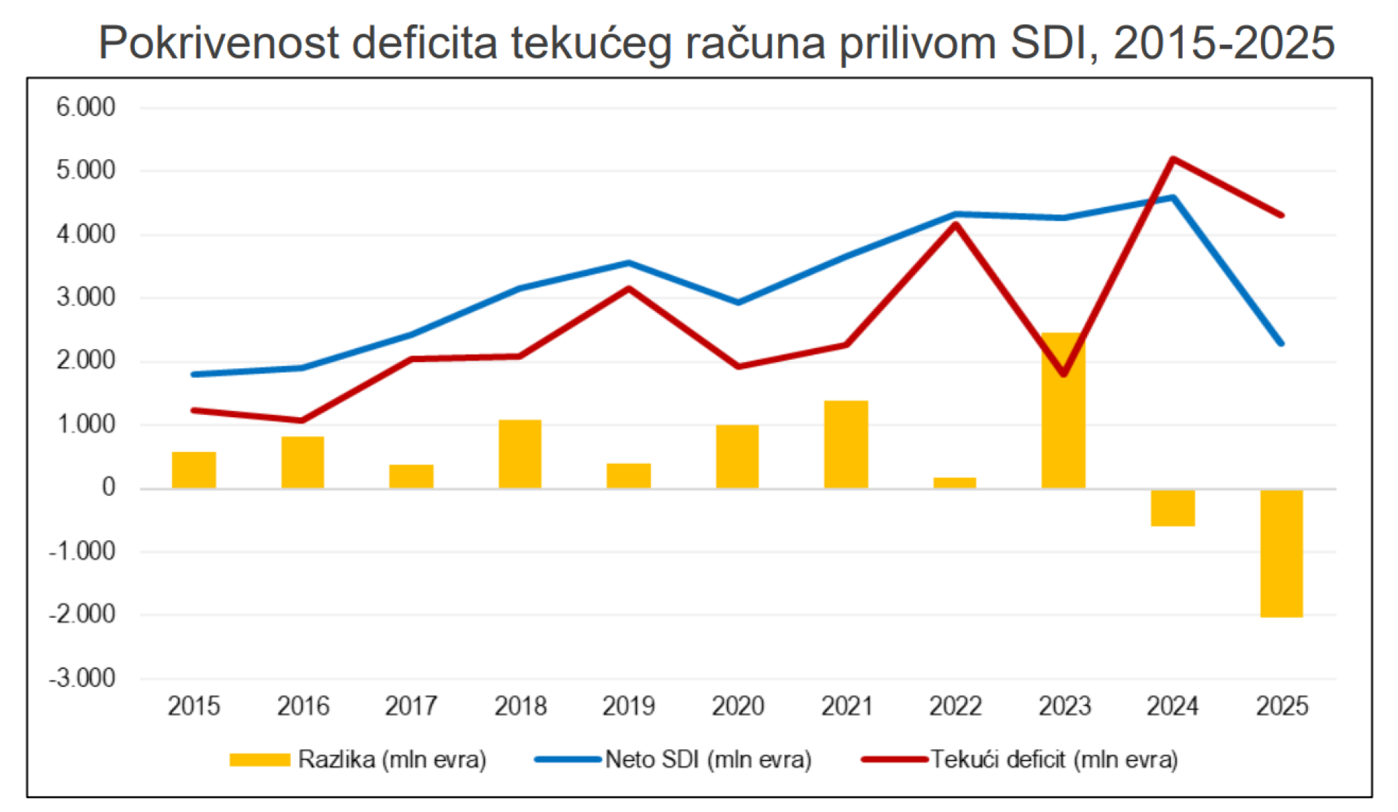 U publikaciji se navodi da je tekući deficit platnog bilansa umereno pogoršan, sa 4,5 odsto BDP-a (3,8 milijardi evra) iz 2024. godine na 4,9 odsto BDP-a (4,3 milijarde evra) u 2025, ali da se najvažnija promena u platnom bilansu "ipak nije desila na tekućem računu, već kod priliva SDI". Prošla godina bila je druga godina zaredom da SDI ne pokrivaju deficit tekućeg računa platnog bilansa.