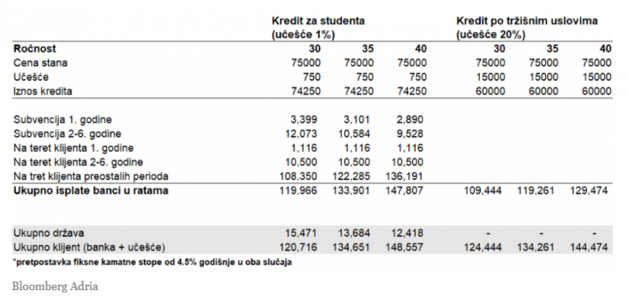 Bloomberg Adria je već ranije izračunala koliko bi vas koštala kupovina stana uz kredit od 75.000 evra koji subvencioniše država. Ukoliko pretpostavimo da je kamatna stopa 4,5 odsto, nešto manja od trenutne koja se nudi na tržištu i da je ona fiksna celi period otplate, vidimo da na kraju klijenti plaćaju sličnu sumu - kredit i učešće, s tim što kod kredita za mlade imamo i državnu subvenciju. Država bi ovaj iznos kredita subvencionisala sa oko 15.000 evra.
