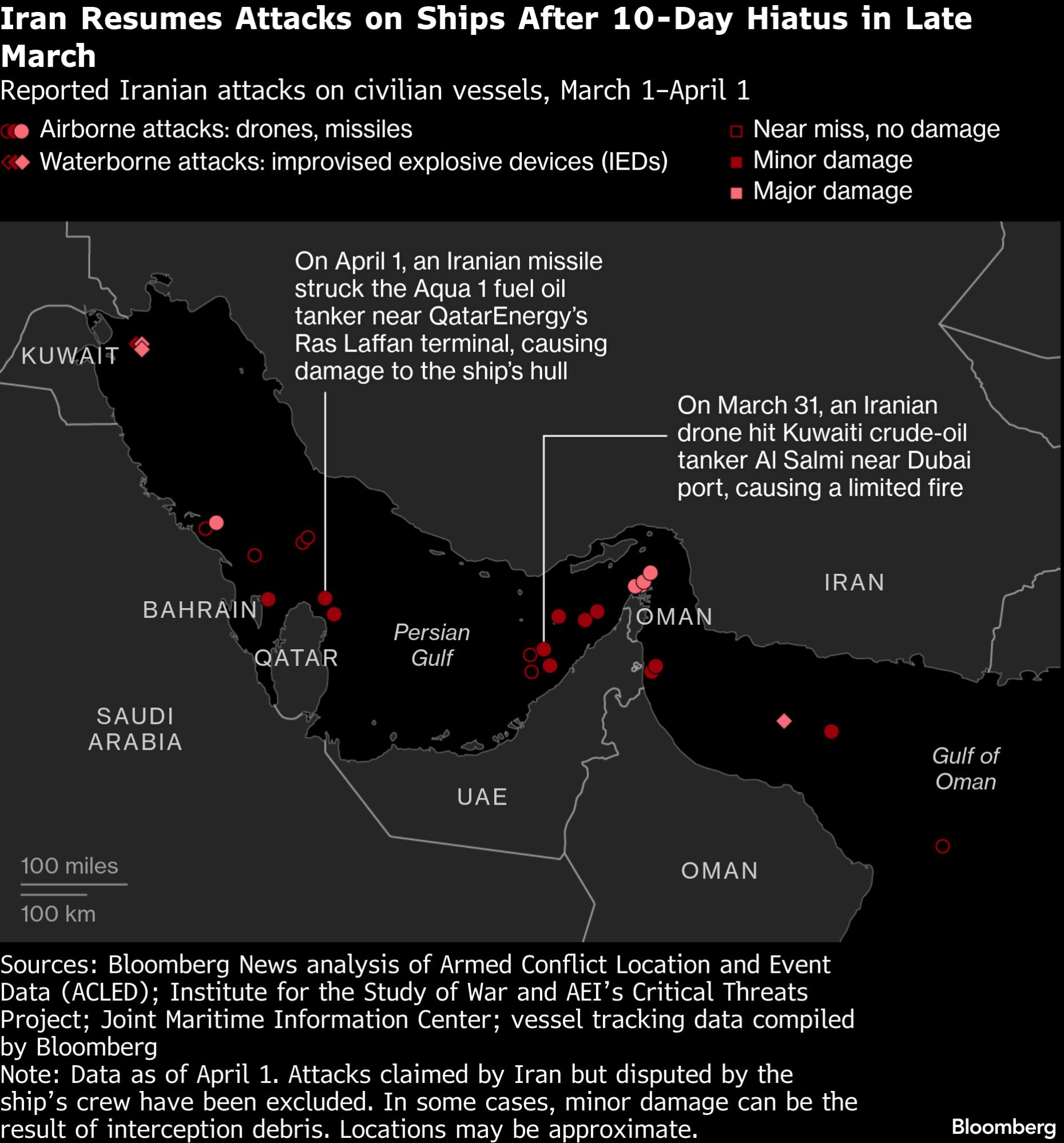 Iran nastavlja napade na brodove nakon 10-dnevne pauze krajem marta | Prijavljeni iranski napadi na civilne brodove, 1. mart - 1. april/Bloomberg