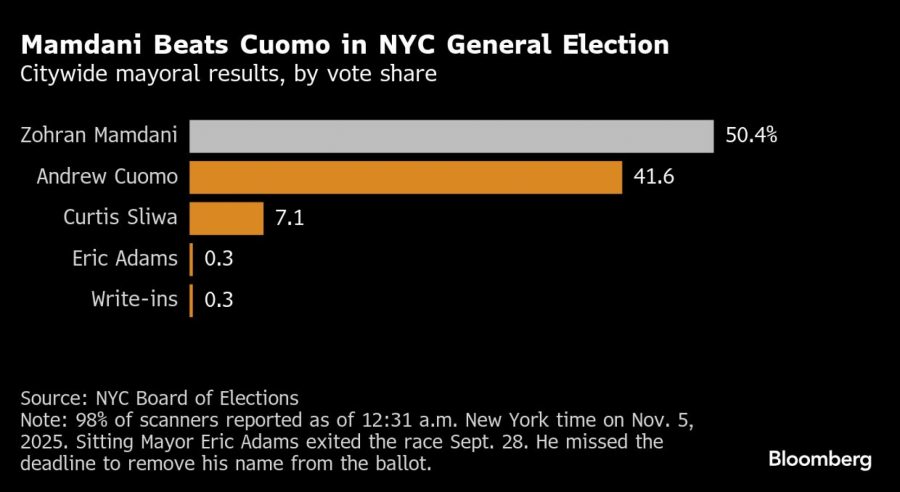 Mamdani, kandidat Demokratske stranke, osvojio je 50,4 odsto glasova, dok je bivši guverner Andrew Cuomo, koji je nakon poraza u stranačkim predizborima nastupio kao nezavisni kandidat, dobio 41,6 odsto glasova, sa 98 odsto prebrojanih biračkih mesta. Republikanski kandidat Curtis Sliwa osvojio je 7,1 odsto.
