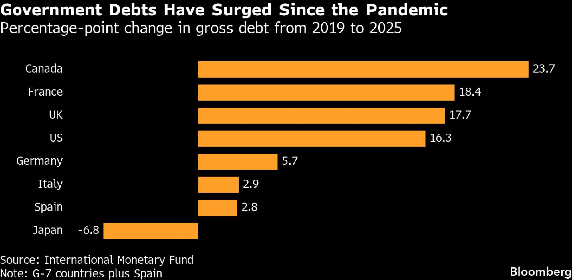 Državni dugovi su naglo porasli od pandemije - promena bruto duga u procentnim poenima od 2019. do 2025 | Bloomberg