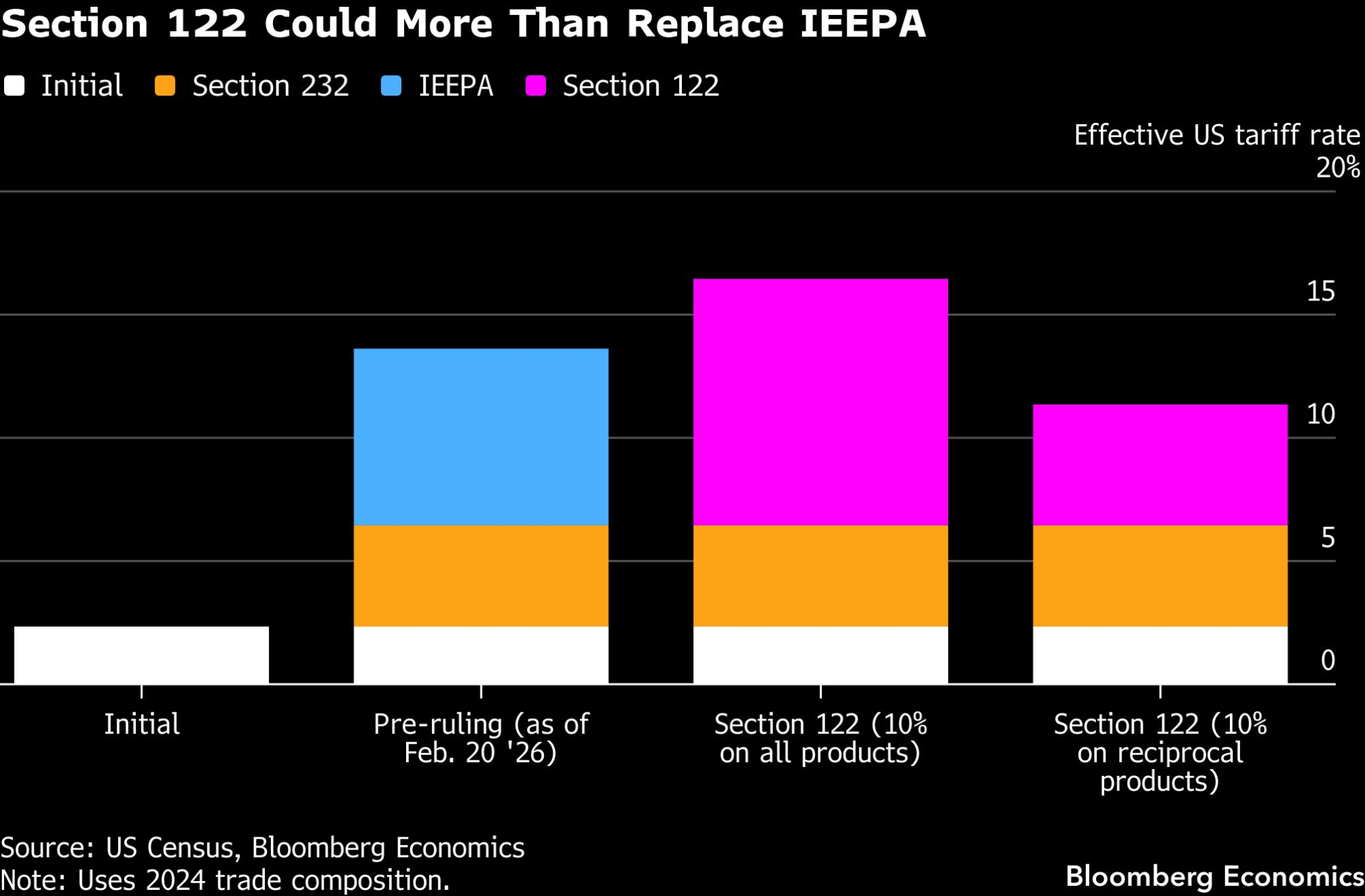Trump se takođe može osloniti na članove 301, 232 i 122 Zakona o trgovini kako bi sproveo svoj režim carina, rekla je Wendi Cutler, viša potpredsednica Instituta za politiku organizacija Asia Society i bivši vršilac dužnosti zamenika američkog trgovinskog predstavnika. Globalna carinska stopa od 15 odsto koju je Trump uveo potpada pod Član 122. Ostala dva člana daju ovlašćenja predsedniku da jednostrano uvede carine, ali samo pošto se sprovede istraga koja obično traju mesecima.