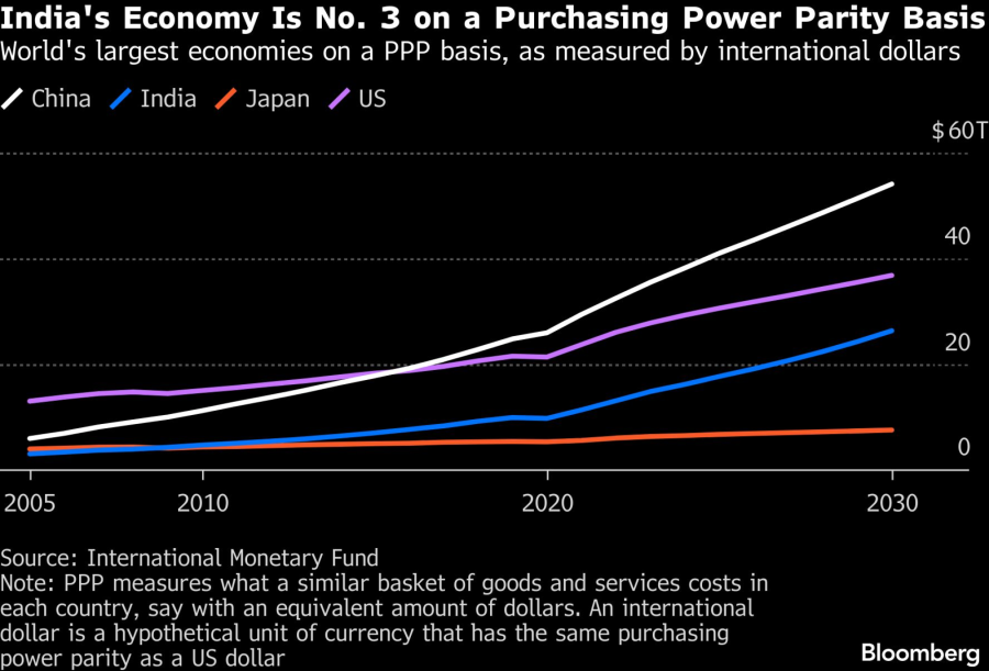 Prema toj metodologiji, Indija je već treća najveća ekonomija sveta, a to je pozicija koju drži još od perioda pre 2010. godine, prema podacima MMF-a. Po tom kriterijumu, MMF očekuje da će indijska ekonomija dostići oko 19,14 biliona dolara 2026. godine, dok se za Japan procenjuje oko 6,92 biliona.