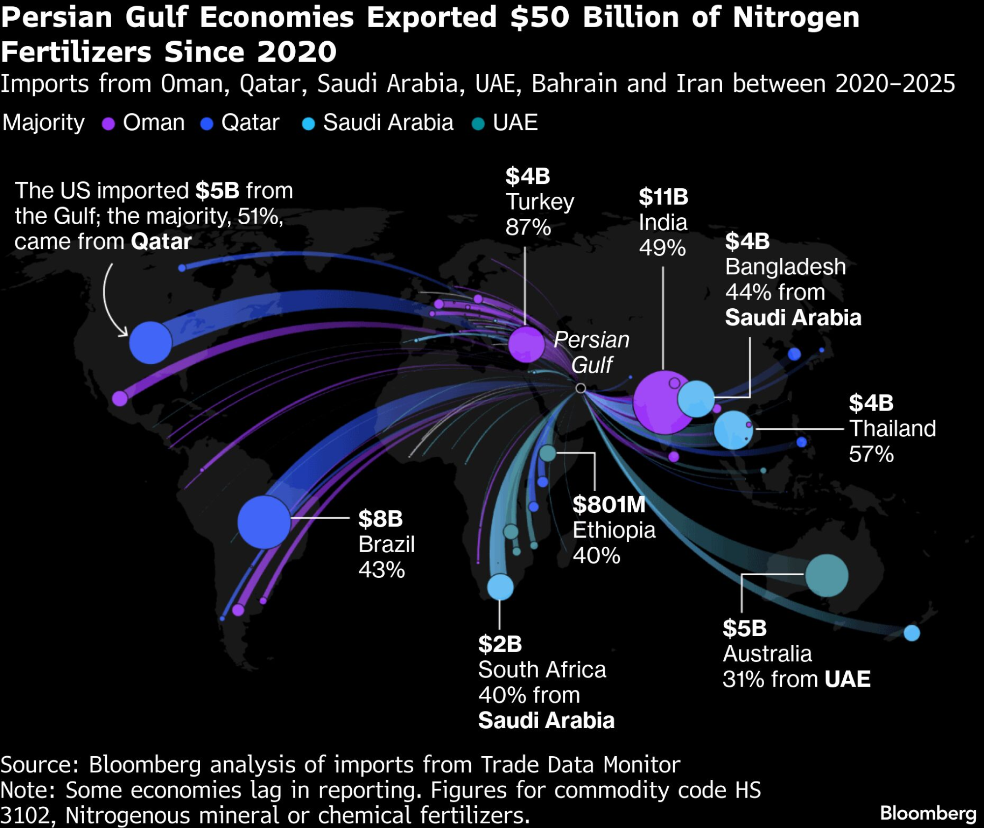 Privrede Persijskog zaliva izvezle su đubriva sa azotom u vrednosti od 50 milijardi dolara od 2020 - uvoz iz Omana, Katara, Saudijske Arabije, UAE, Bahreina i Irana, 2020-2025 | Bloomberg