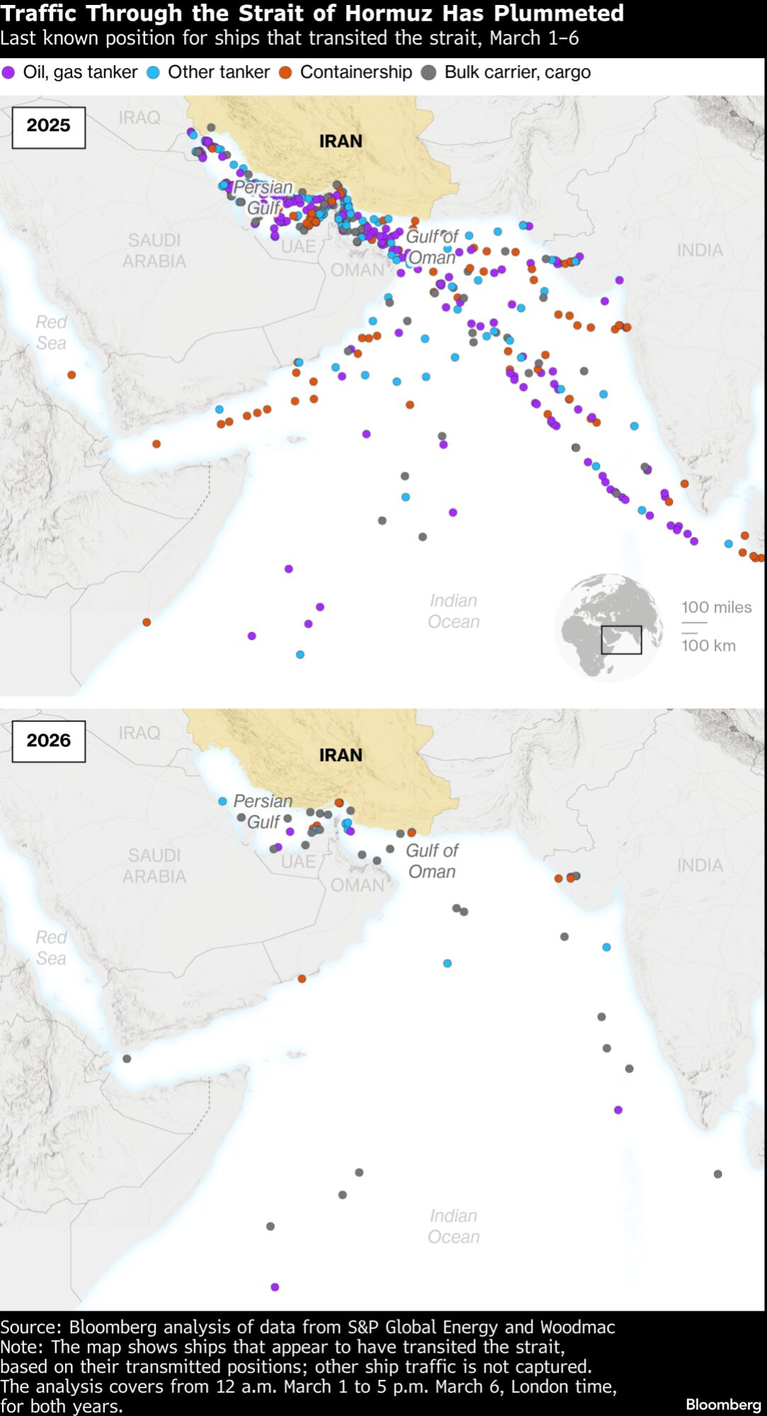 Samo mali broj brodova prošao je kroz moreuz od prošle subote, kada su SAD i Izrael izveli vazdušni napad na Iran. Teheran je uzvratio, ispaljujući dronove i rakete na ciljeve širom Zaliva. Analiza podataka o transportu brodova od 1. do 6. marta pokazuje da je saobraćaj trgovačkih brodova oko Ormuskog moreuza pao za više od 85 odsto u odnosu na isti period prošle godine; oko petina ovih prelaza bila je van vidokruga sistema za automatsku identifikaciju brodova.