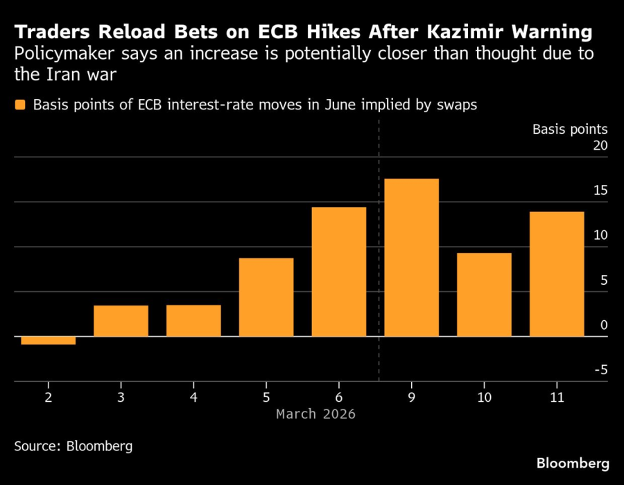Trgovci procenjuju da će rast troškova energije izazvan sukobom na Bliskom istoku naterati ECB da ove godine podigne kamatne stope, uprkos tome što je Donald Trump rekao da bi rat mogao da se završi "vrlo brzo". Sećanja na poslednji talas rasta cena u Evropi iz 2022. i dalje su sveža, a strah je da bi se inflacija ponovo mogla razbuktati.