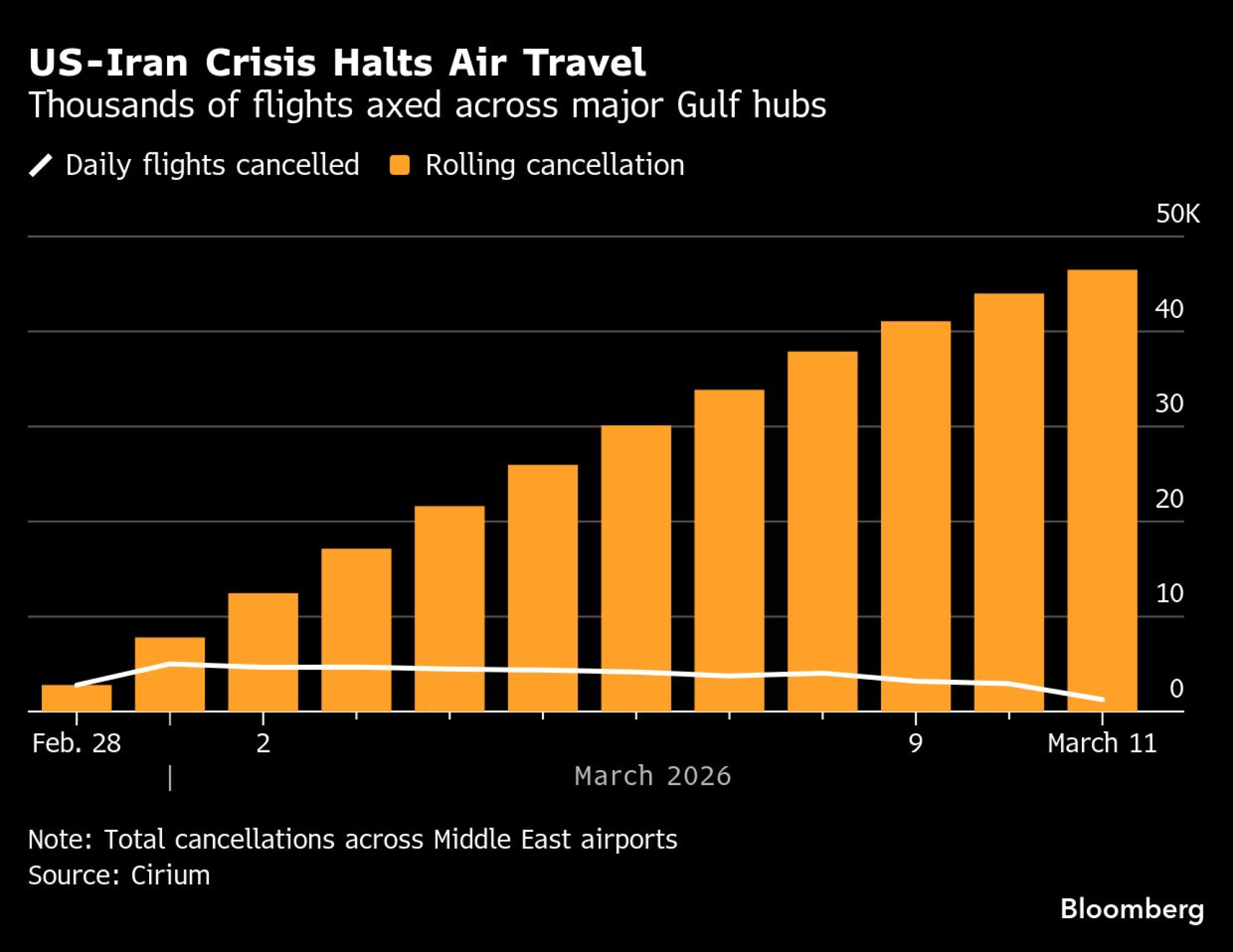 Od početka sukoba 28. februara otkazano je više od 46.000 letova, pokazuju podaci kompanije Cirium Ltd. Zbog krize, ukupni kapaciteti avio-kompanija u svetu smanjeni su za oko 10 odsto početkom marta, što predstavlja najveći udar na avijaciju od početka pandemije kovida 19.