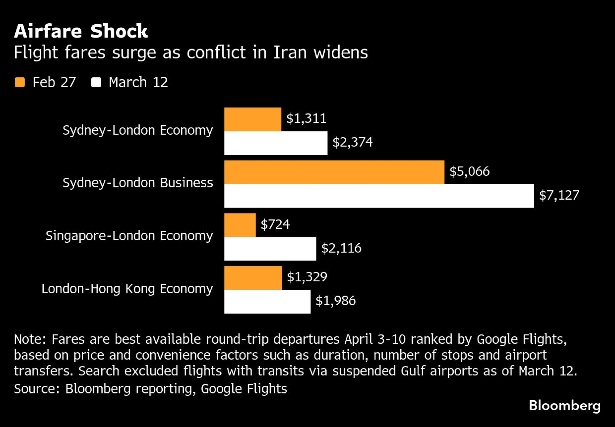 Nagli pad kapaciteta avio-prevoza zbog zatvaranja aerodroma u Persijskom zalivu podstakao je rast cene karata na nekim ključnim rutama. Povratna karta u ekonomskoj klasi na liniji Sidnej-London za period od 3. do 10. aprila poskupela je za više od 80 odsto u protekle dve nedelje, dok je karta u biznis klasi za istu rutu bila oko 40 odsto skuplja, proističe iz Bloombergove analize zasnovane na podacima sa platforme Google Flights od 12. marta.