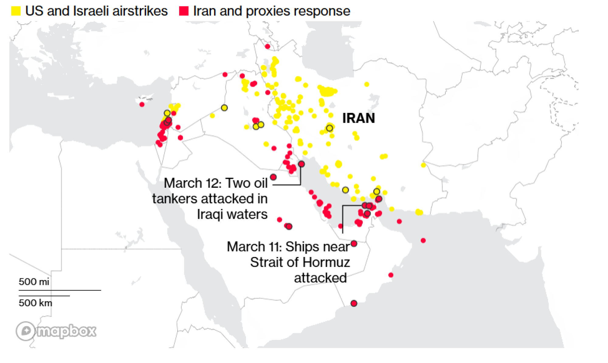 Napadi od 28. februara, najnoviji su označeni krugom