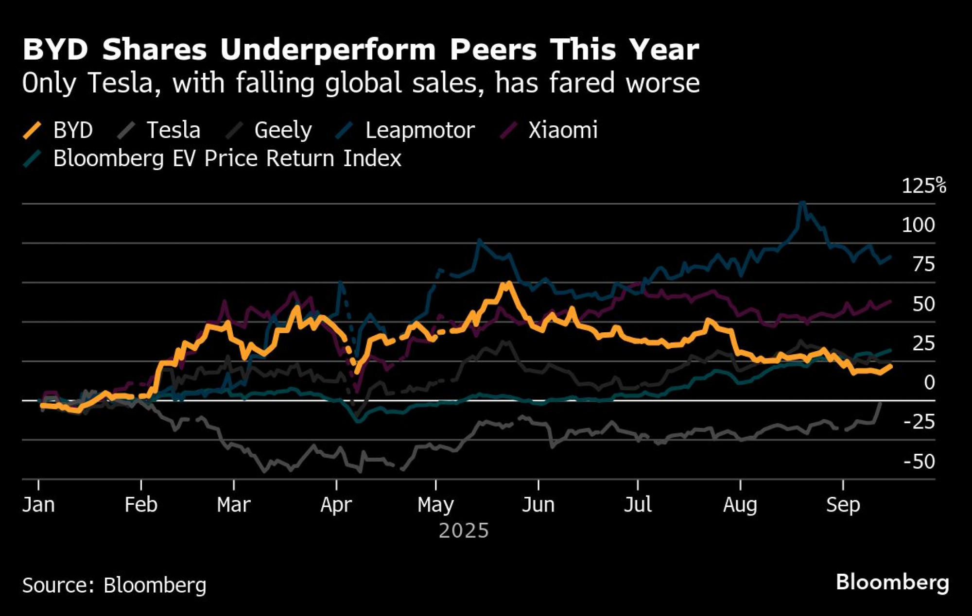 Akcije BYD-ja, koje kotiraju na berzi u Hongkongu, od marta beleže slabiji rezultat od većine domaćih konkurenata. Iako BYD i dalje ubedljivo predvodi po prodaji, rivali poput Leapmotora, Geelyja i Xiaomija beleže snažan rast, doduše sa nižeg početnog nivoa.