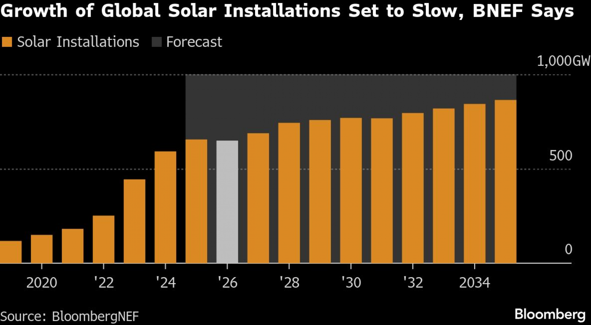 Prema izveštaju Global PV Market Outlook koji je objavio BloombergNEF (BNEF), u svetu bi tokom 2026. godine trebalo da se instalira 649 gigavata novih solarnih kapaciteta, što predstavlja blagi pad u odnosu na 2025. godinu. Rast u ovoj godini već je najslabiji u poslednjih sedam godina, a pad koji se očekuje naredne godine bio bi prvi takav još od 2000. godine.
