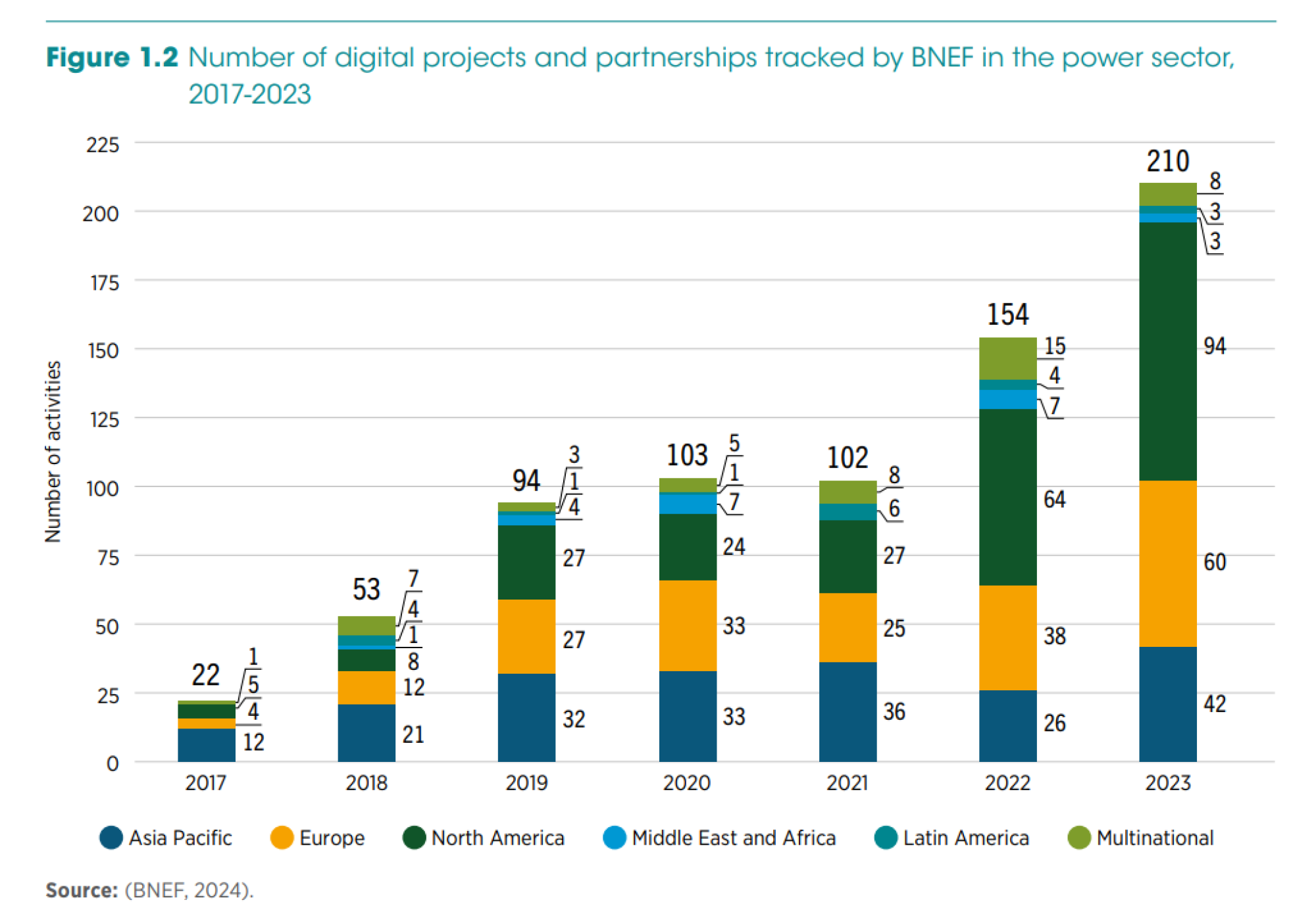 Broj digitalnih projekata i partnerstava u elektroenergetskom sektoru koje je pratio Bloomberg New Energy Finance (BNEF) između 2017. i 2023. godine | Izvor: BNEF/IRENA