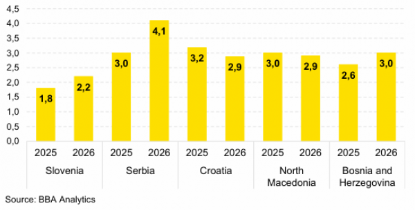 We expect the Adria region to remain on a stable growth path in 2025, driven by domestic demand, rising real incomes, and solid labour markets. Household spending and construction activity continue to support GDP across Croatia, Bosnia and Slovenia, while Serbia and North Macedonia also benefit from strong credit dynamics. The main drag remains external demand, with weaker EU growth and export volatility limiting the contribution from trade. Workforce shortages remain a common structural issue across all economies.