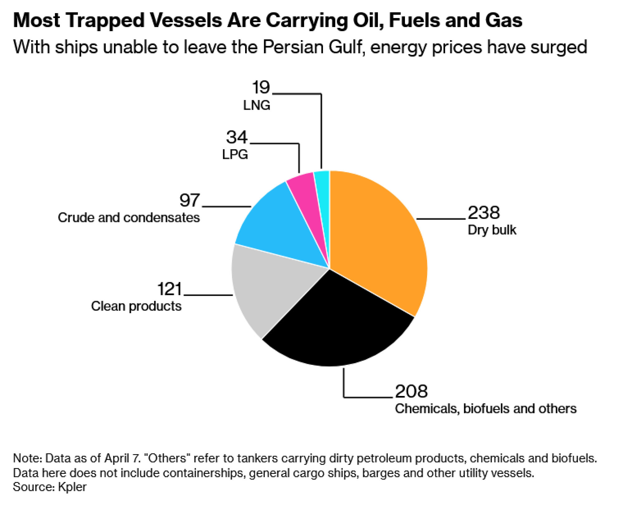 Prema podacima kompanije Kpler, brodovi koji prevoze energente čine veliki deo flote blokirane unutar Zaliva. Trenutno postoji 426 tankera koji prevoze sirovu naftu i naftne derivate, 34 broda za prevoz ukapljenog naftnog gasa i 19 brodova za prevoz ukapljenog prirodnog gasa (LNG). Ostatak flote prevozi rasute terete, poput poljoprivrednih ili metalnih proizvoda, kao i kontejnere.