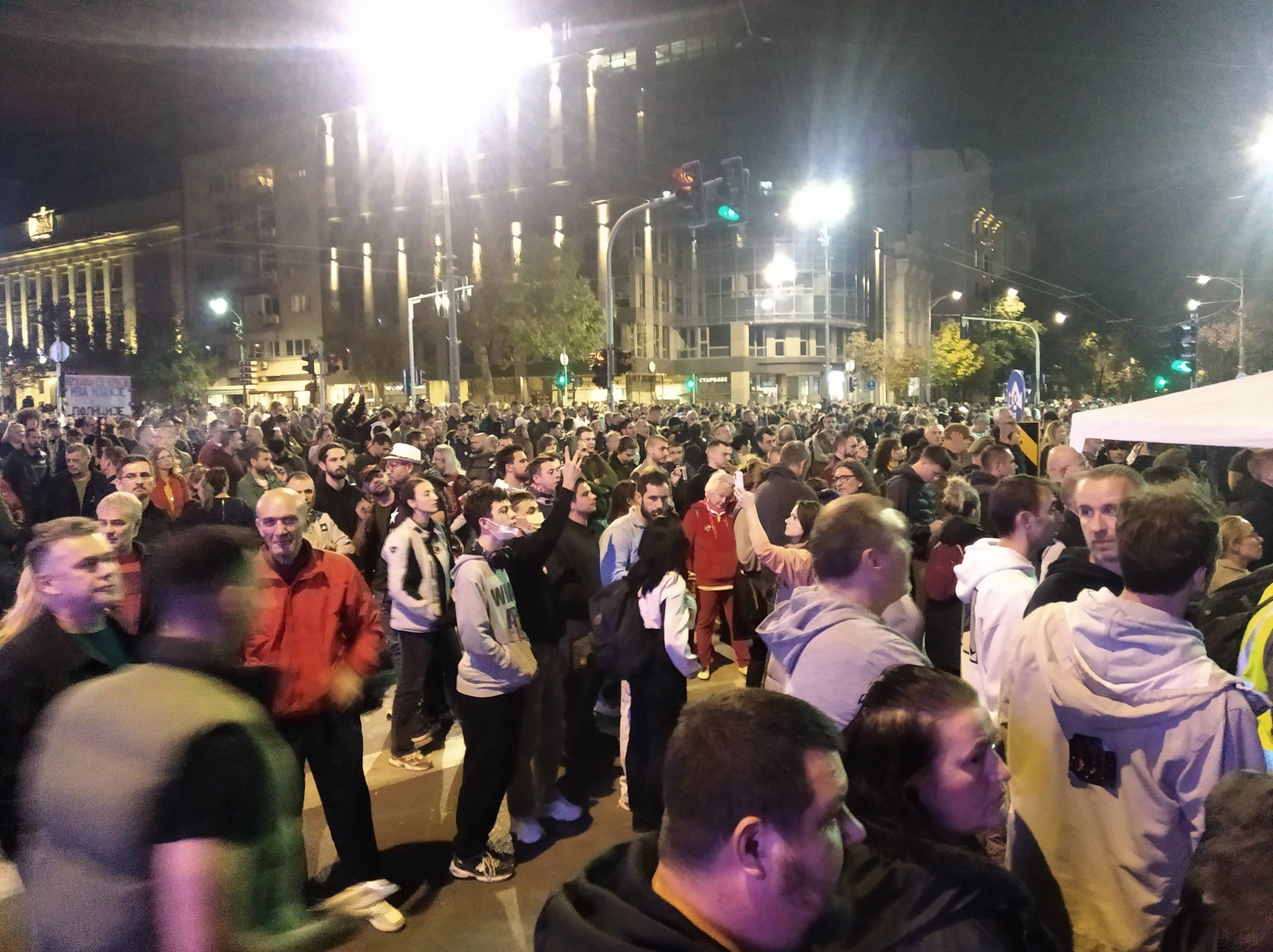 Građani su se u popodnevnim satima okupili kraj metalne ograde koja deli takozvani "Ćacilend", šatorsko naselje pristalica vlasti i zgradu Skupštine Srbije od Bulevara kralja Aleksandra, jer Hrku policija nije pustila da dođe do stepenica Skupštine, gde je nameravala da štrajkuje.
