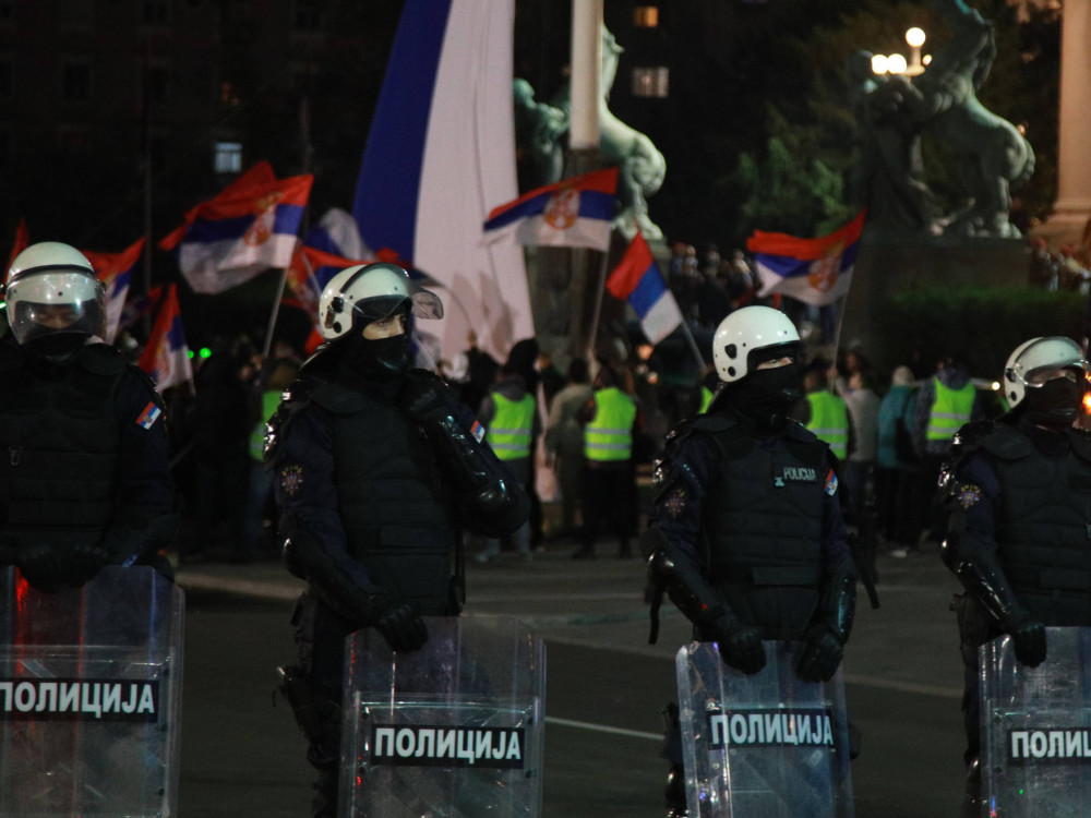 Jake policijske snage raspoređene su oko Doma Narodne skupštine, gde se trenutno održavaju dva skupa – jedan pristalica vlasti u šatorskom naselju i drugi na mestu gde štrajkuje glađu Dijana Hrka, majka Stefana Hrke, poginulog pre godinu dana u padu nadstrešnice na Železničkoj stanici u Novom Sadu.