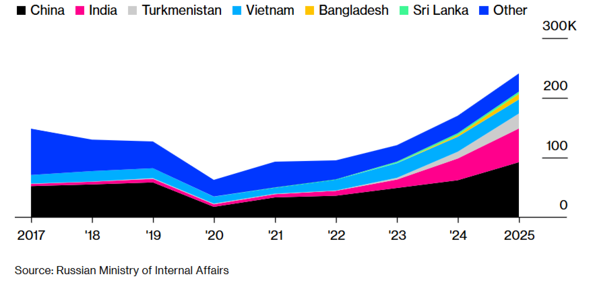 Čak i pre tog dogovora, broj radnih dozvola koje je Rusija izdala Indijcima skočio je prošle godine na više od 56.000, sa oko 5.000 u 2021. godini. Ukupan broj radnih dozvola izdatih strancima porastao je na više od 240.000 u 2025. godini, što je najviši nivo najmanje od 2017, pokazuju podaci Ministarstva unutrašnjih poslova. Dok su odobrenja značajno porasla za bivšu sovjetsku republiku Turkmenistan, veliki deo rasta strane radne snage dolazi iz udaljenijih zemalja -uključujući Indiju, Bangladeš, Šri Lanku i Kinu.