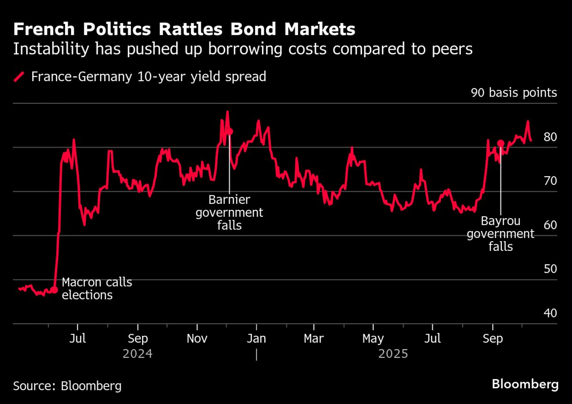 Pošto već godinu dana nema većinu u parlamentu, ministri se bore s budžetskim problemima koji su doveli do toga da Francuska ima najveći deficit u evrozoni. Kombinacija političkih i fiskalnih rizika uzdrmala je investitore, izazvala rasprodaju francuske imovine i povećala troškove zaduživanja države.