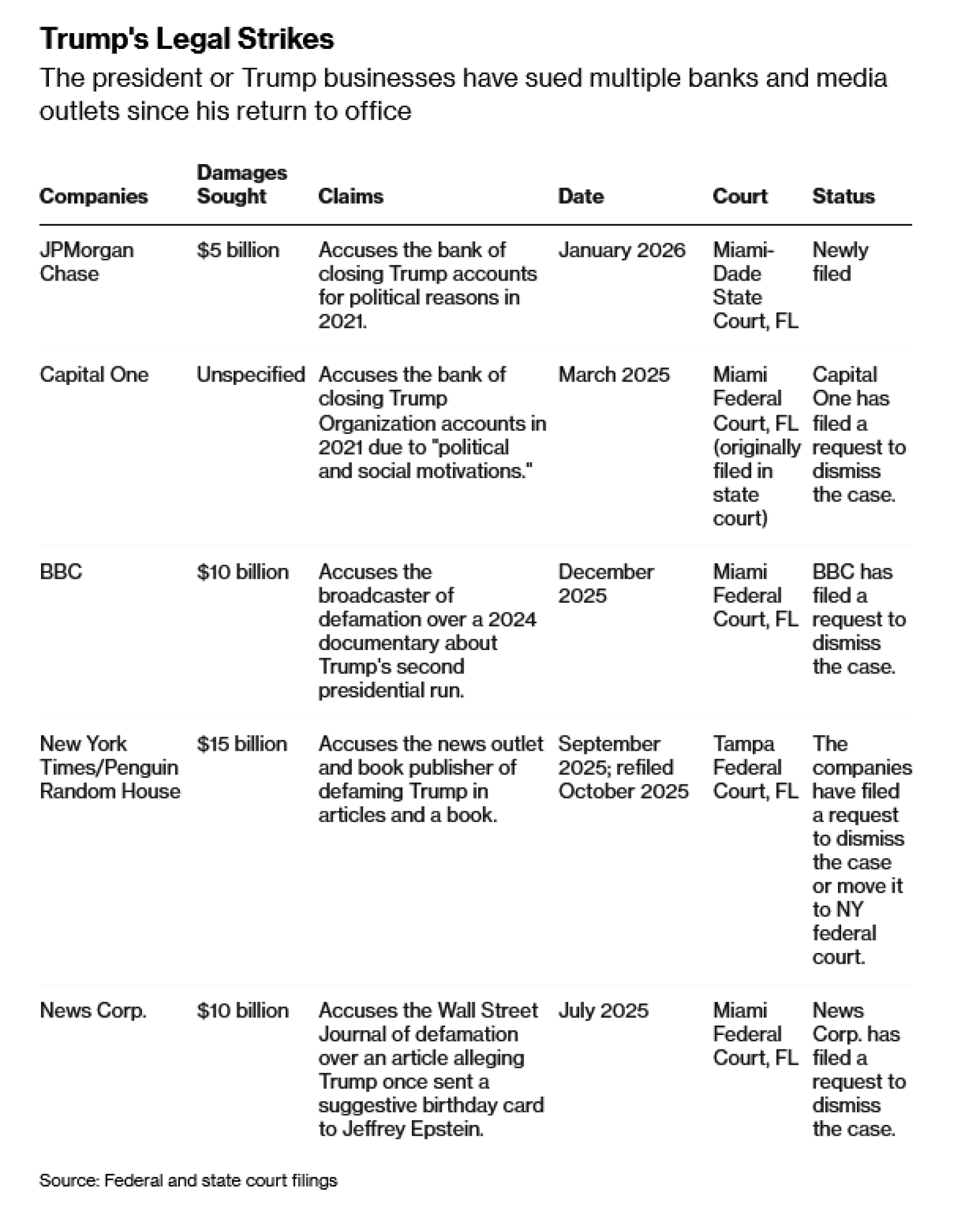 Konglomerat The Trump Organization tužio je Capital One u martu zbog navodnog potkopavanja njegovih poslova otkazivanjem stotina računa nakon njegovog prvog mandata. Tužba, prvobitno podnesena na državnom sudu u Floridi, a zatim preneta na savezni sud u Miamiju, tvrdi da su Trumpove firme decenijama bile klijenti Capital One, obavljajući transakcije u desetinama miliona dolara.