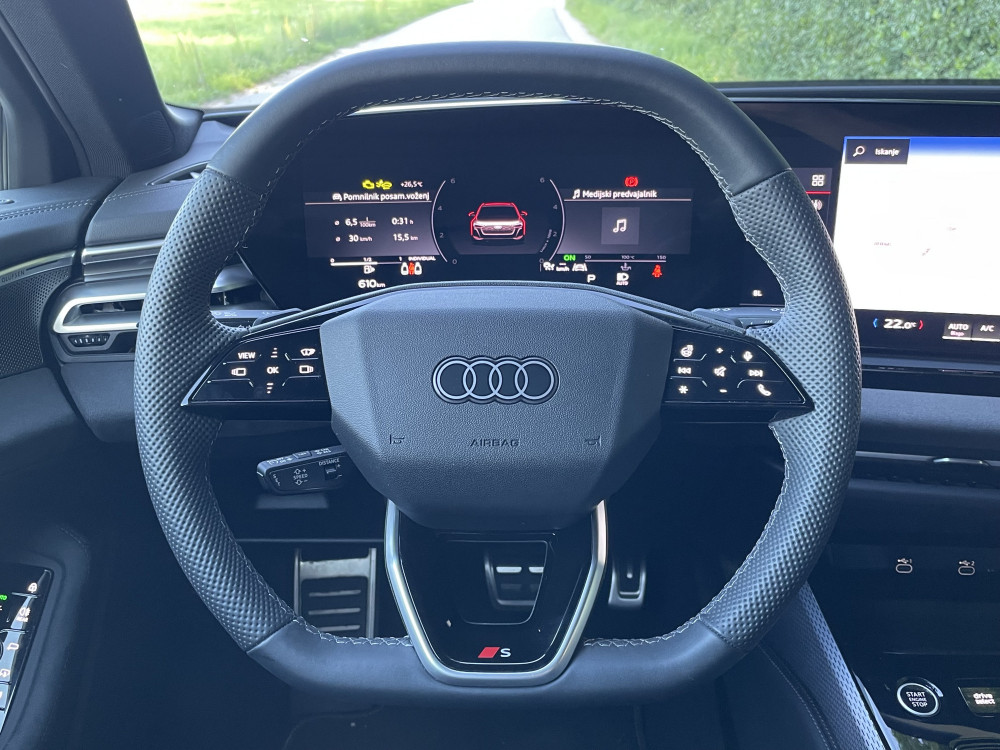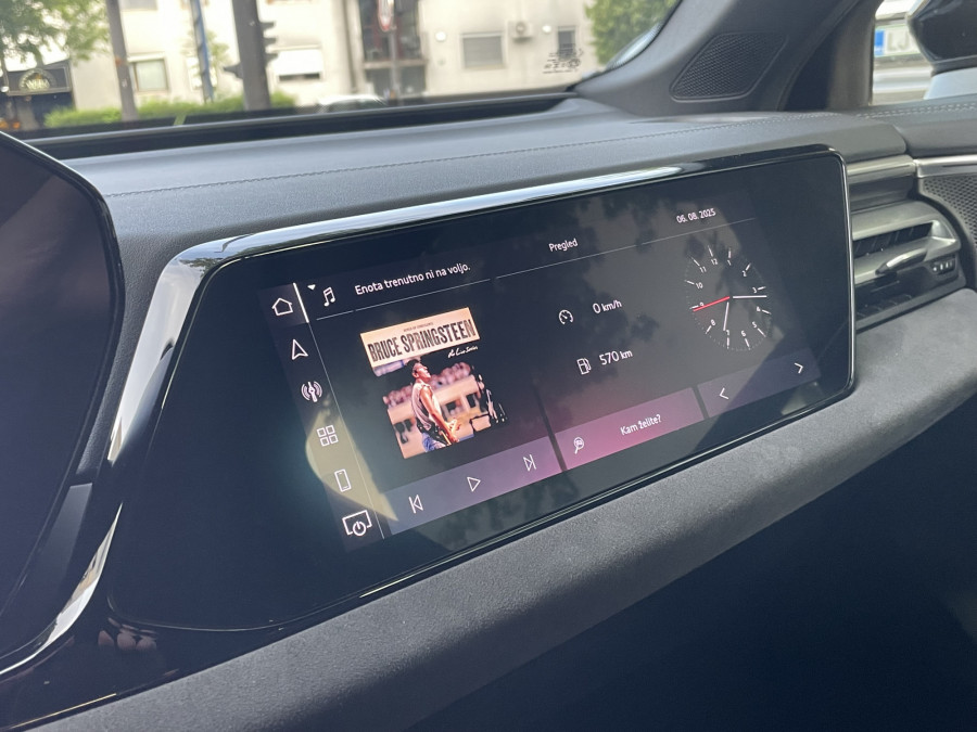 Pred vozačem se ističe zakrivljeni panoramski ekran, zapravo dva ekrana, arhitektura koju je Audi najavio još kod modela "Q6 e-tron". Ekran sa instrumentima i osnovnim informacijama o vožnji, neposredno pred vozačem, ima dijagonalu od 30 cm, dok je centralni multifunkcionalni ekran sa svim meni opcijama i kontrolama osetljiv na dodir, veličine 36,8 cm.