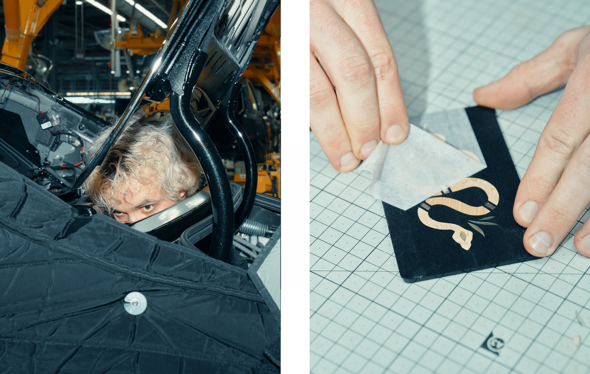 Tehničar radi na automobilu na proizvodnoj liniji (levo), a desno je detaljan prikaz nanošenja zlatnog lista na prilagođeni unutrašnji deo u Centru za unutrašnje površine | Murray Ballard/Bloomberg