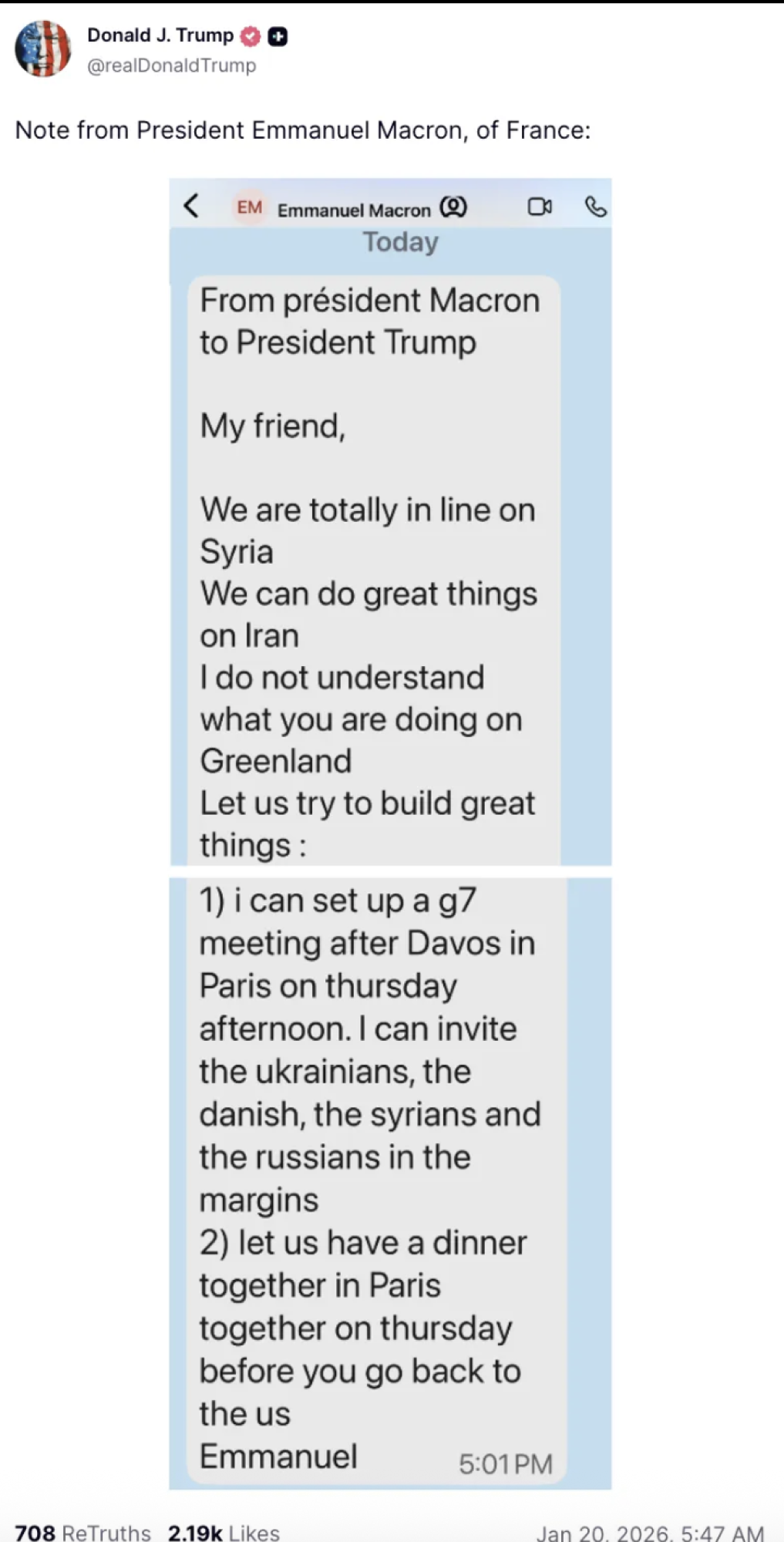 Objavio je i privatnu tekstualnu poruku od Macrona, u kojoj ga francuski predsednik poziva na večeru u Parizu i u kojoj ga direktno kritikuje: "Ne razumem šta radite na Grenlandu."