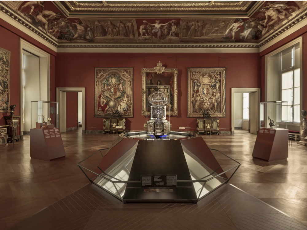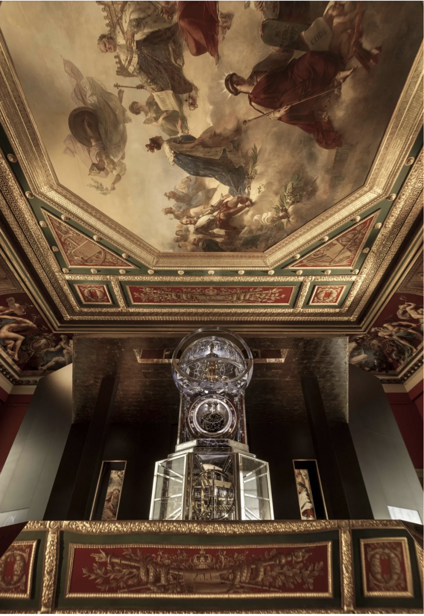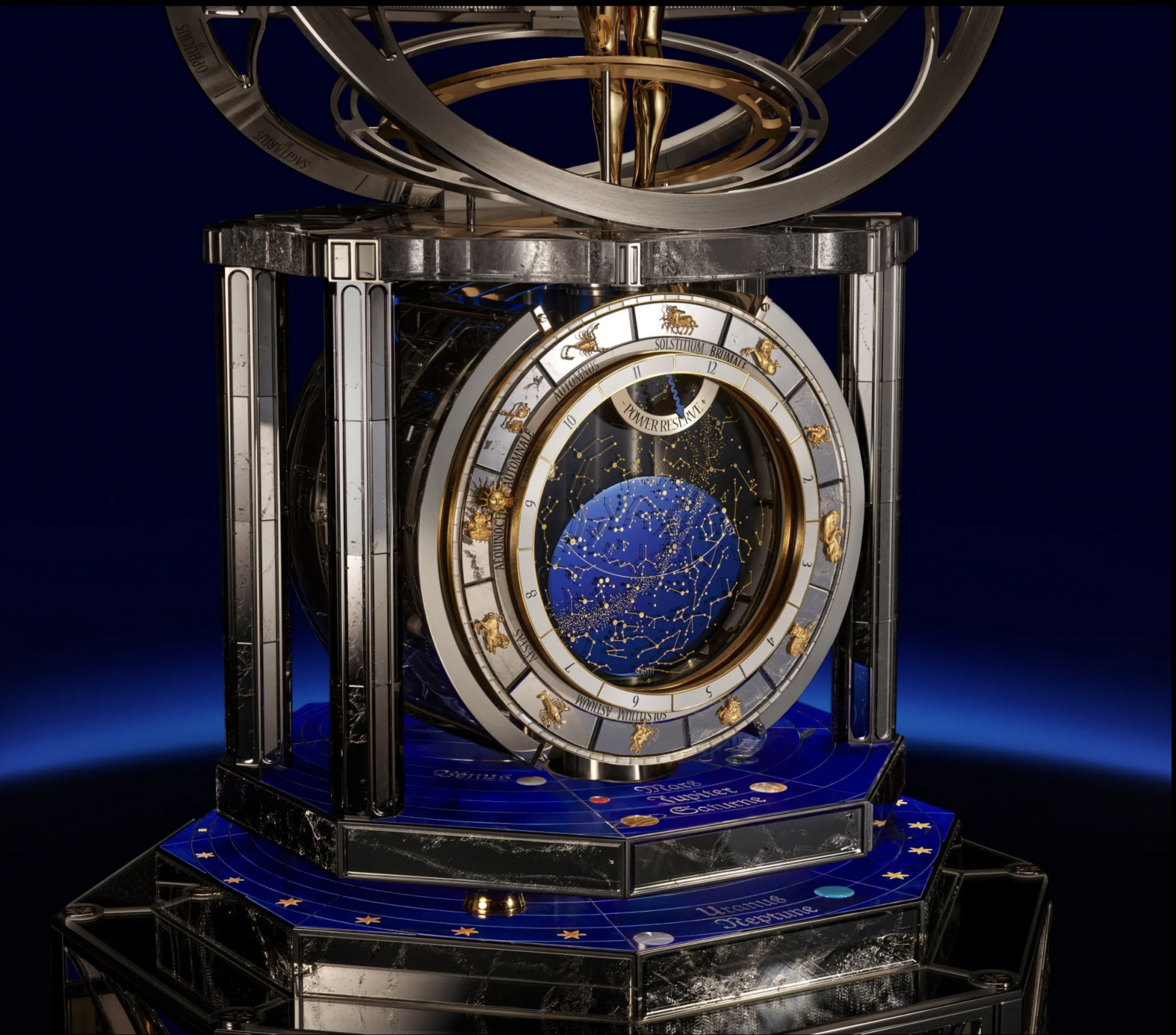 U centru salona, ispred ogromne slike Luja XIV, stoji široka osmostrana piramida sa ogledalima na svakoj strani širine oko šest metara. Njeni uglovi deluju gotovo vanzemaljski naspram baroknog okruženja. Na njenom vrhu nalazi se nešto jednako nestvarno: raskošna konstrukcija od kristala, delikatnih metalnih zupčanika i blistavog zlata, visoka nešto više od jednog metra. U njenom postolju nalaze se mehanizmi koji podsećaju na unutrašnjost muzičke kutije; u sredini je sat, on prikazuje sate, minute, mesece, dane, godinu, mesečeve mene i vreme izlaska i zalaska sunca. Na neki način, u toj spravi se mogu razaznati i godišnja doba, solsticiji i zvezde na nebu, a sve to leži na ploči od lapis lazulija sa umetnutim planetama od sedefa. Na vrhu sata stoji zlatni čovek visok oko 28 centimetara, okružen staklenom kupolom na kojoj su ugravirane konstelacije zodijaka.